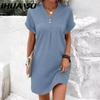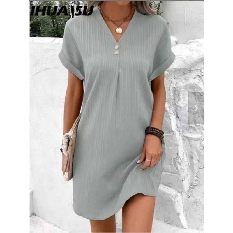 IHUASU Летнее женское платье с V-образным вырезом на пуговицах с коротким рукавом, свободный однотонный пуловер, повседневная одежда, мини-платье