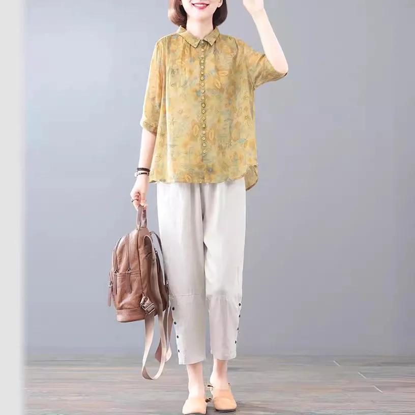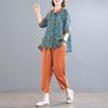 Женская мода хлопок лен 2 шт ретро женский продвинутый принт комплект из двух частей весна лето дамы короткий рукав тонкий костюм