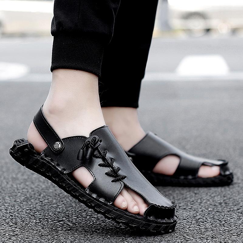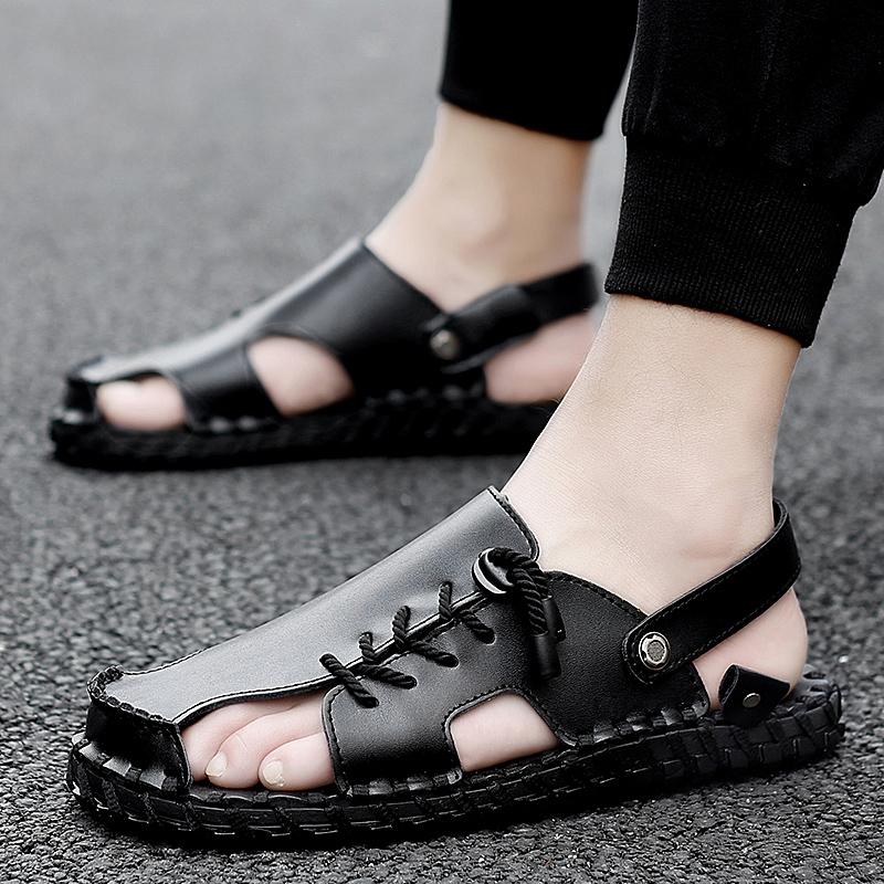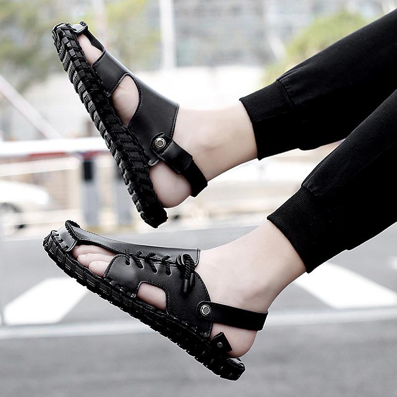 Сандалии мужские летние прилив новый стиль кожаный носок открытый отдых спорт полые сандалии пляжная обувь