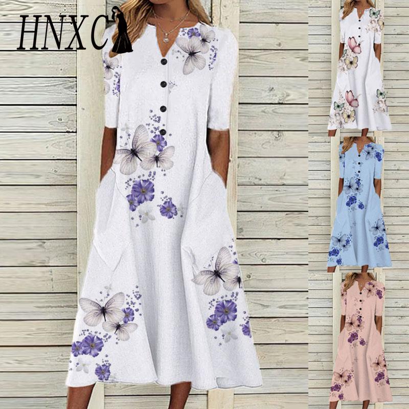 HNXC Элегантные женские платья с V-образным вырезом, коротким рукавом, на пуговицах, вечернее платье, женское летнее винтажное платье с принтом, повседневные свободные цветочные женские платья
