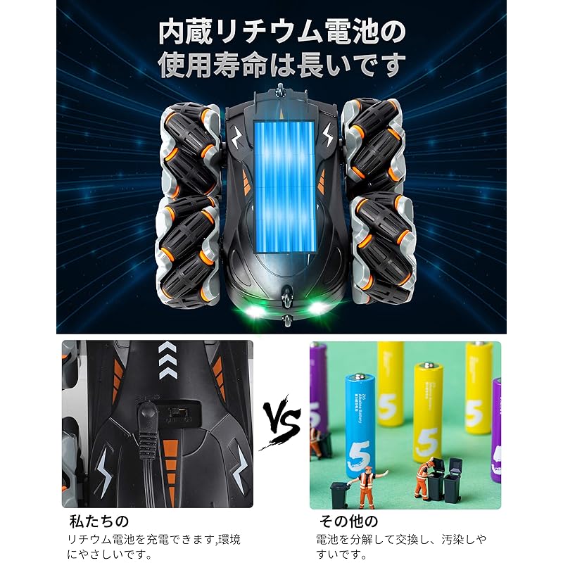 [2.4GHz Wireless Radio Wave, No Interference] The stunt car is equipped with a 2.4GHz remote control system, which can prevent signal interference when multiple vehicles are playing at the same time.The remote control for remote control cars of the same model is universal. Even at a range of about 40 meters, the wireless controller can still control your car remotely!