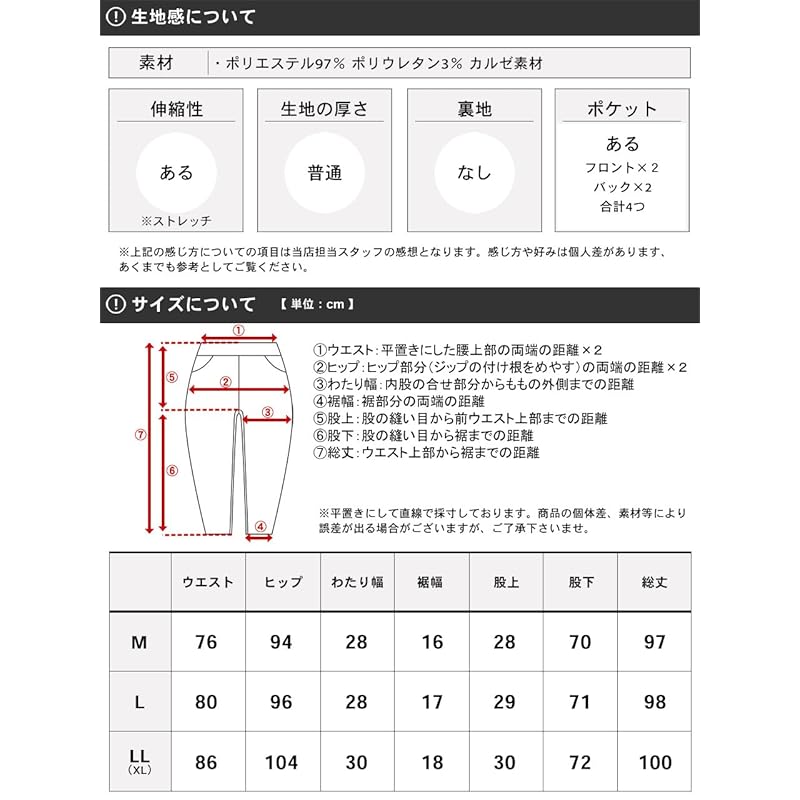 M size = Waist 76cm, Hips 94cm, Waist width 28cm, Hem width 16cm, Rise 28cm, Inseam 70cm, Total length 97cm (Size corresponding to bottom label) Waist 76-84cm