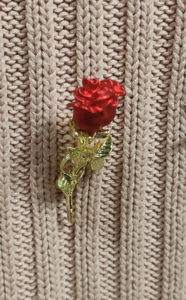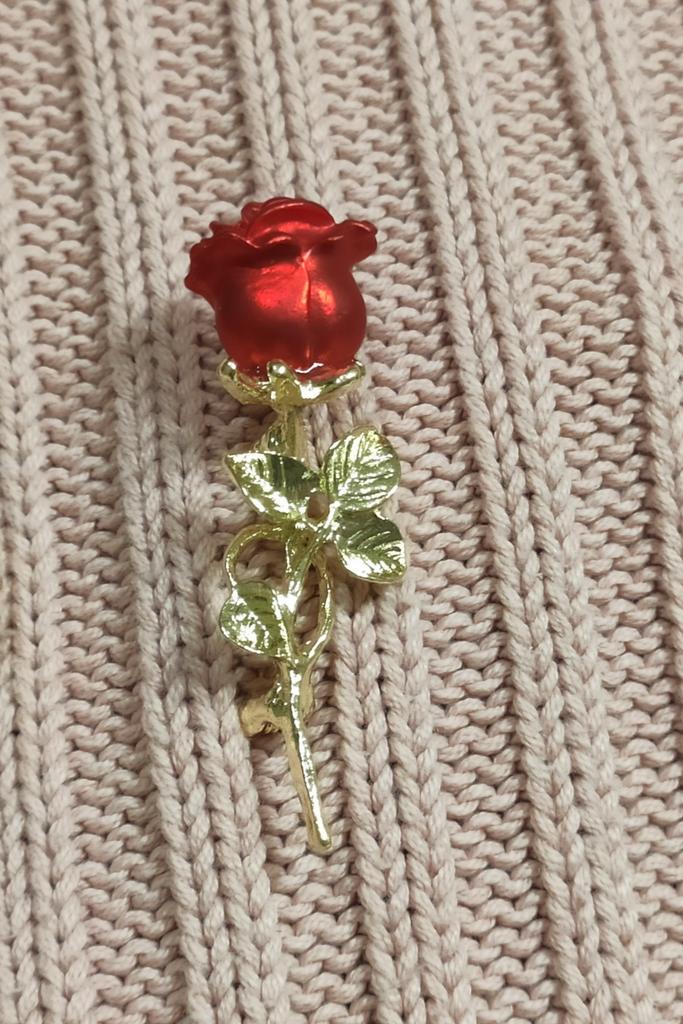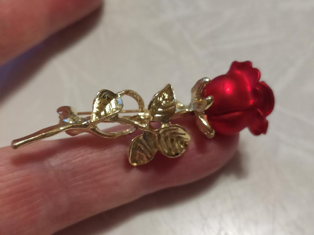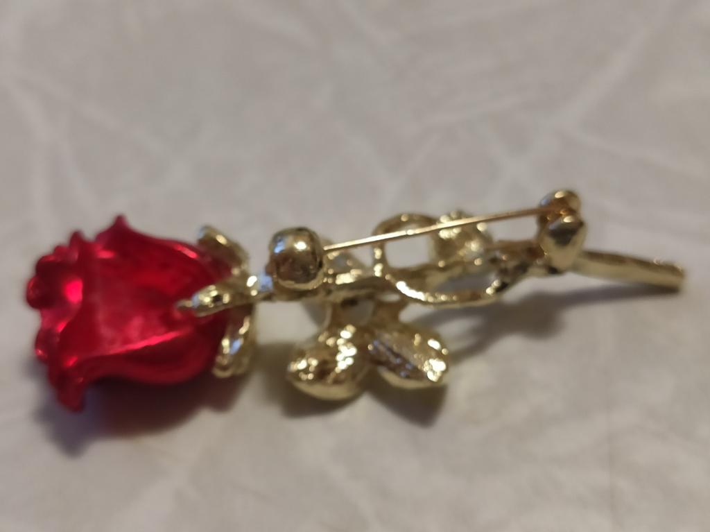 Маленькая, качественно выполненная роза. Красивая! Как настоящая. У меня представлена на толстом Х/Б трикотажном свитере снимок лёжа и если свитер одеть. Видно как брошь отвисает. Замочек смещён и припаян ниже положенного. Буду закалывать на толстый пиджак. Очень красивая!!! Рекомендую к покупке. Спасибо продавцу и Joom