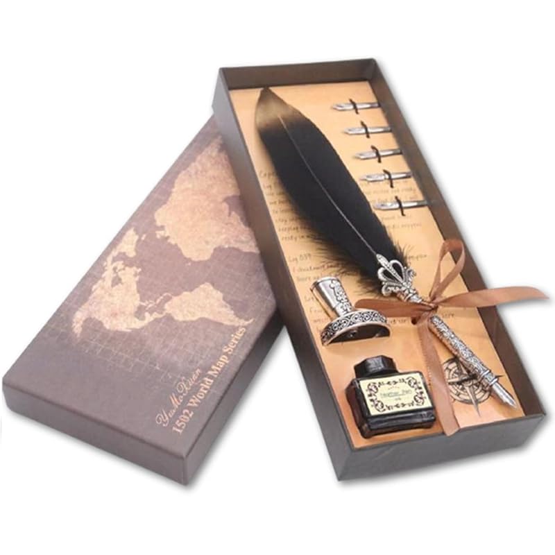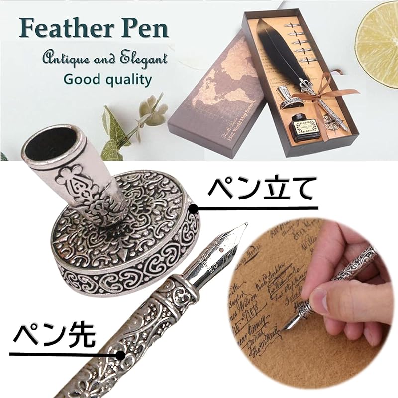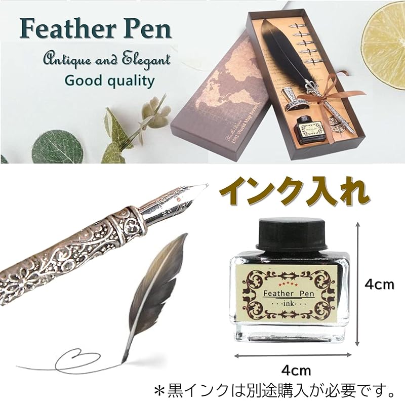 dilib feather pen fountain pen stand ink bottle set antique feather dip pen (black)