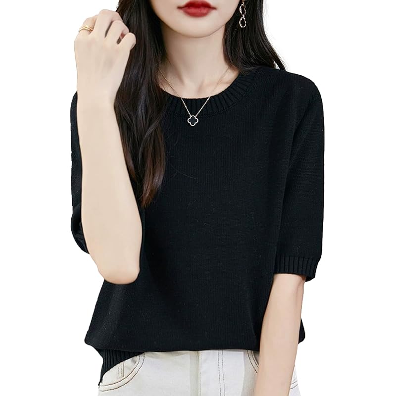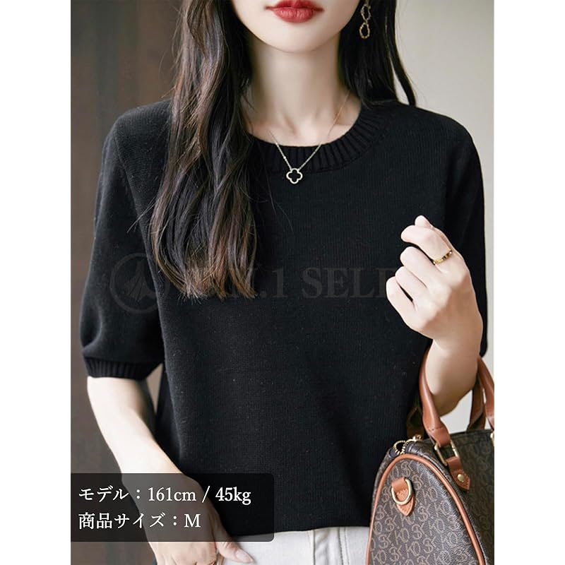 [Details (fabric feel and design attention)] ●Clean crew neck → A clean basic crew neck creates an elegant look around the face.A beautiful silhouette that doesn't feel sluggish when layered or worn alone.●Comfortable with no tags → Since there are no tags on the back of the neck, you won't feel any stress on your skin, providing stress-free comfort.●Elegant half-sleeves → Covers the upper arms just the right amount while adding a relaxed feel.Perfect for the change of seasons.In addition, the ribbed cuffs add a subtle accent, creating a simple yet sophisticated look.●Ribbed hem design → Beautifully trimmed around the waist, design that is easy to match with pants or skirts.The hem is not too wide and has a loose silhouette, so it can be worn with tops or out.