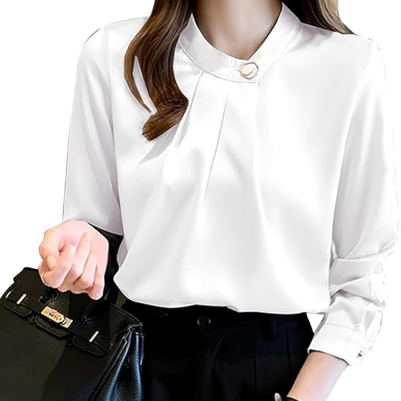 [Attractive Elegant Design] A long-sleeved blouse with an elegant ring accent at the neck.The simple yet sophisticated design makes it perfect for offices and formal occasions.The tuck on the front creates a three-dimensional feel and creates a feminine silhouette.Although it has a subtle design, it combines elegance and glamor, giving an elegant impression even without accessories.Another nice feature is that the moderately open neckline makes your face look neat.
