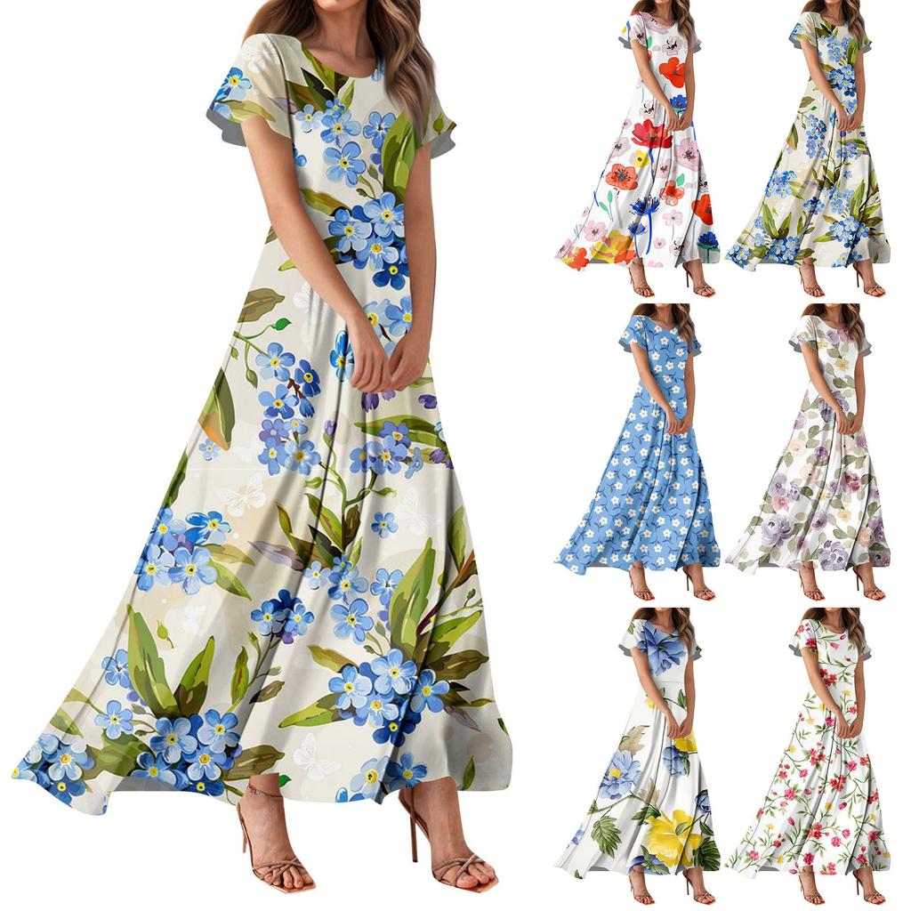 Женское повседневное платье с гавайским принтом, круглым вырезом, короткими рукавами и высокой талией