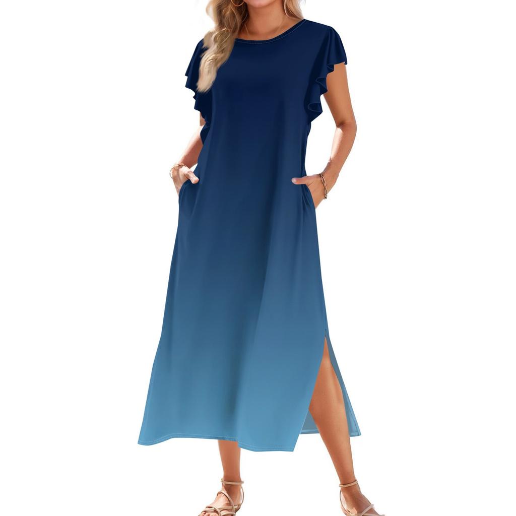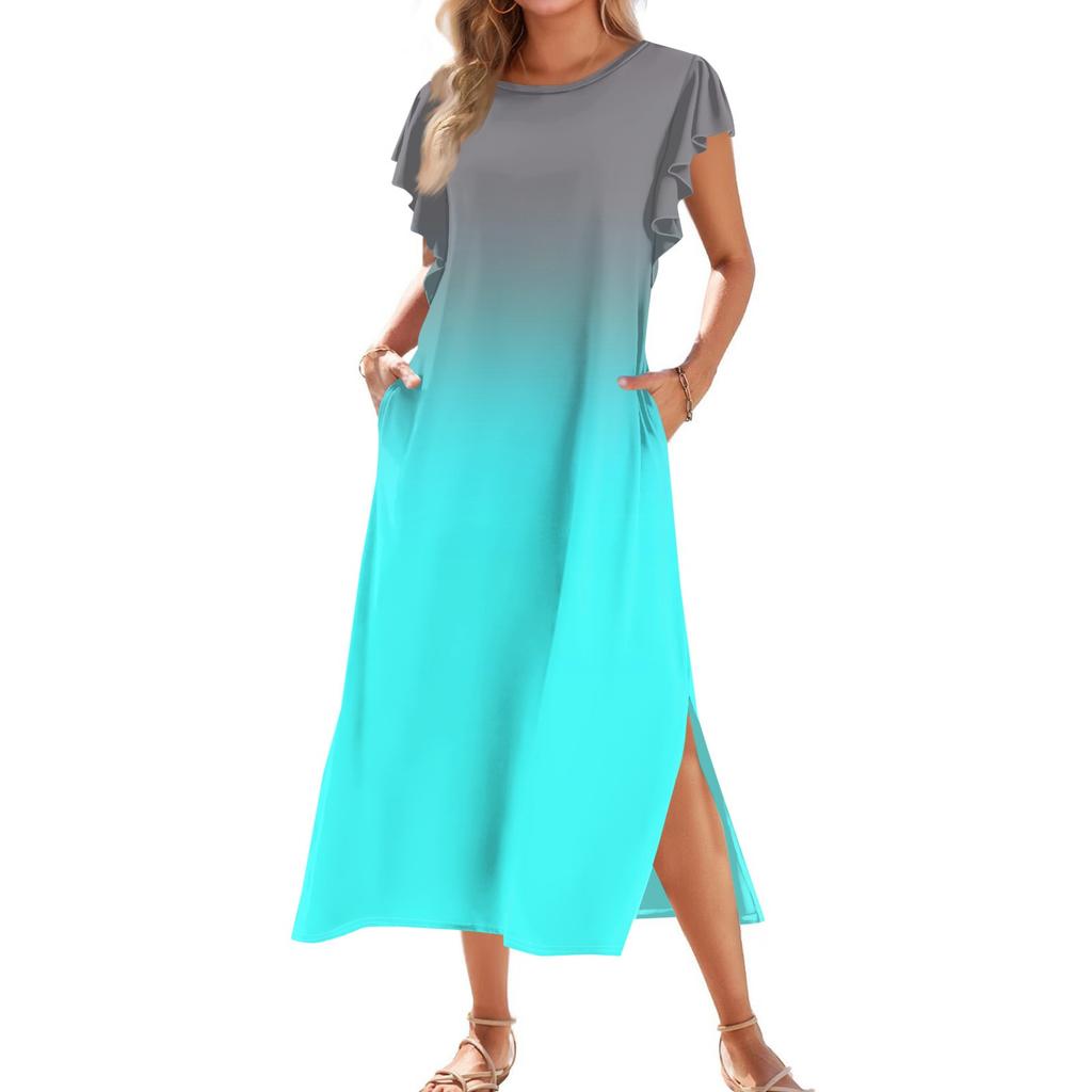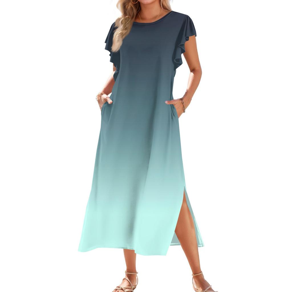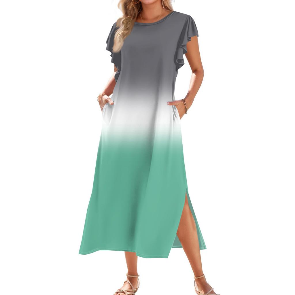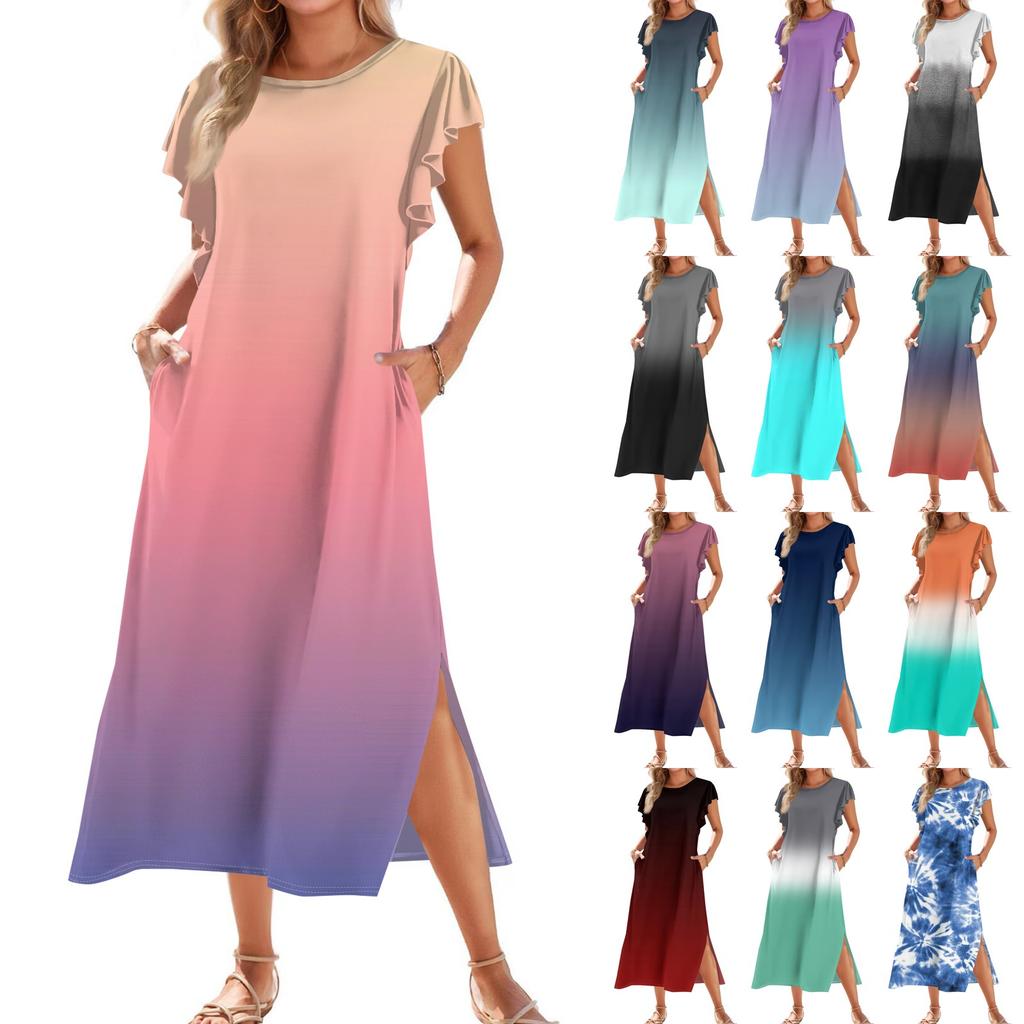 Женское модное летнее повседневное пляжное платье с плиссированными рукавами, свободными короткими рукавами с градиентным принтом, круглым галстуком и карманом