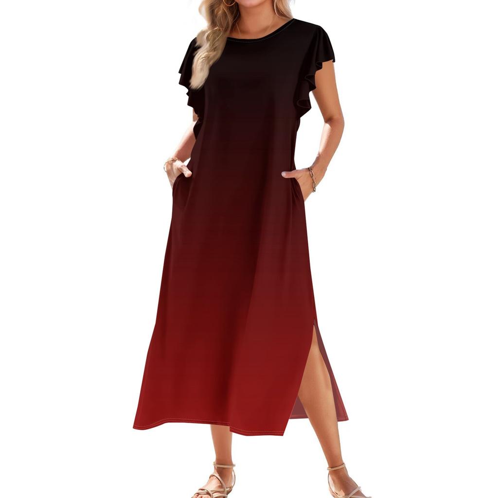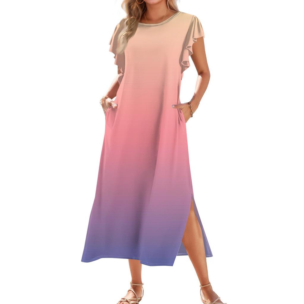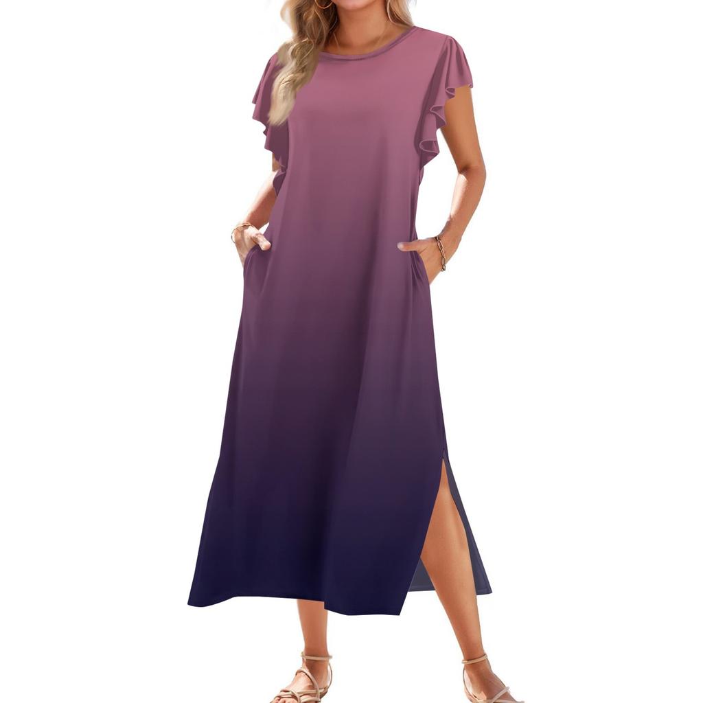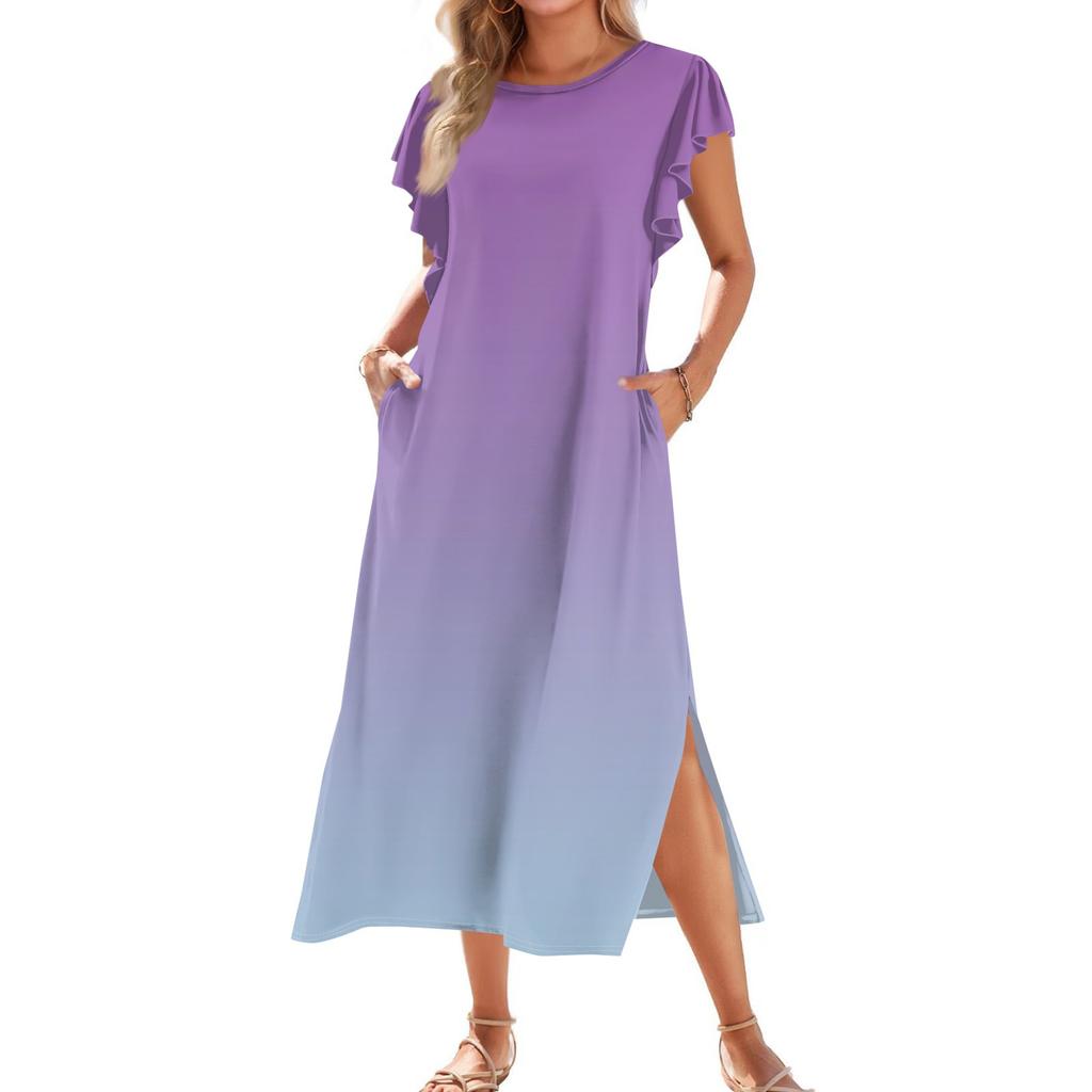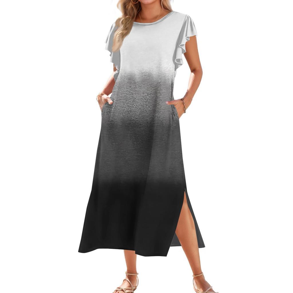 Женское модное летнее повседневное пляжное платье с плиссированными рукавами, свободными короткими рукавами с градиентным принтом, круглым галстуком и карманом