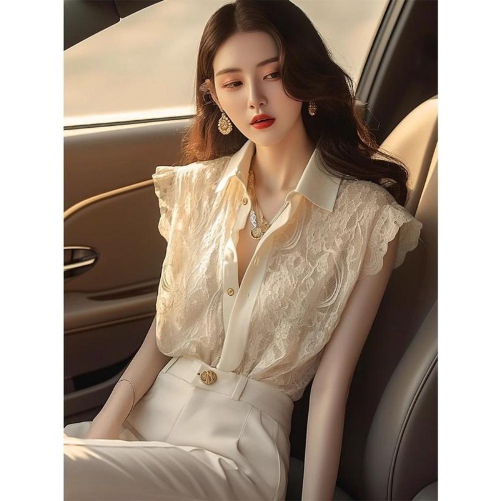 Маленькая кружевная блузка с короткими рукавами для женщин, летний шик, лацканы, пуговицы, темпераментный топ — купить товар онлайн с бесплатной доставкой по всему миру!