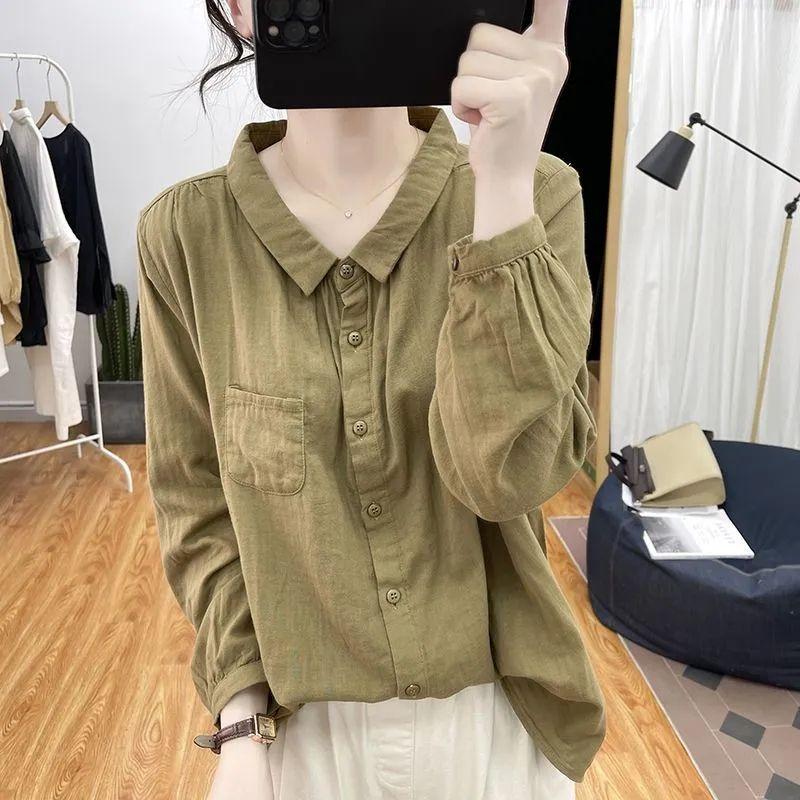 Однотонная рубашка с длинными рукавами для женщин, свободный и утягивающий верх, рубашка в стиле ретро