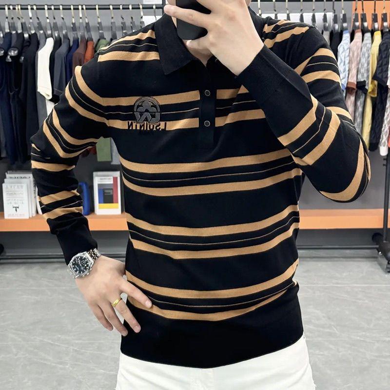 Осенняя простая роскошная полосатая контрастная рубашка поло с длинными рукавами и воротником, трикотажная для мужчин — купить товар онлайн с бесплатной доставкой по всему миру!