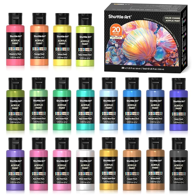 [Chameleon Color Set] Pearlescent color acrylic paint set with 20 colors (60ml/volt).Each color features a vibrant, shimmering pearlescent effect that, like a diamond, changes as the light and viewing angle changes.This can work well on both black and white surfaces.It spreads well and can be layered or blended, and you can enjoy more colors by mixing colors.It's beautiful and sparkles like a galaxy.