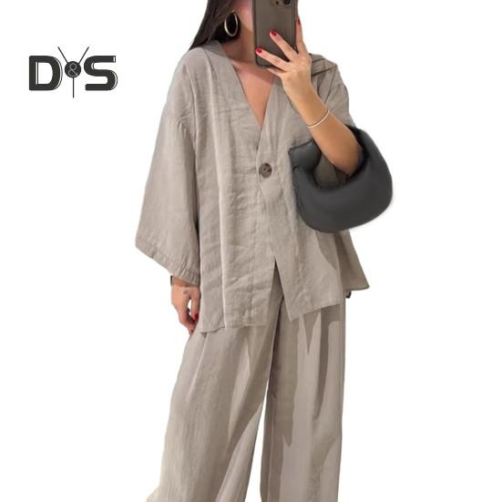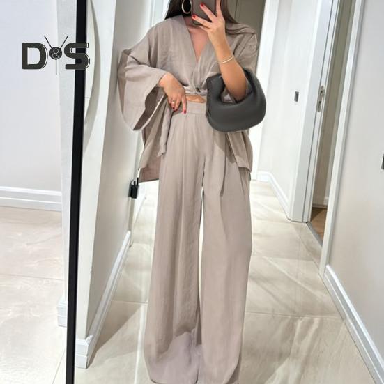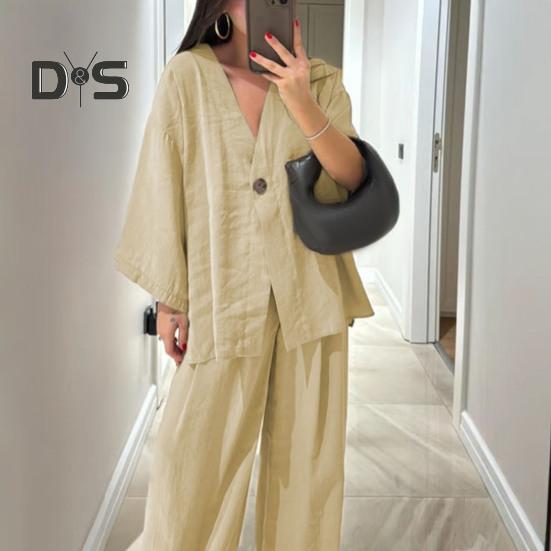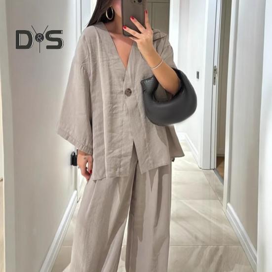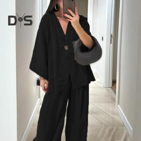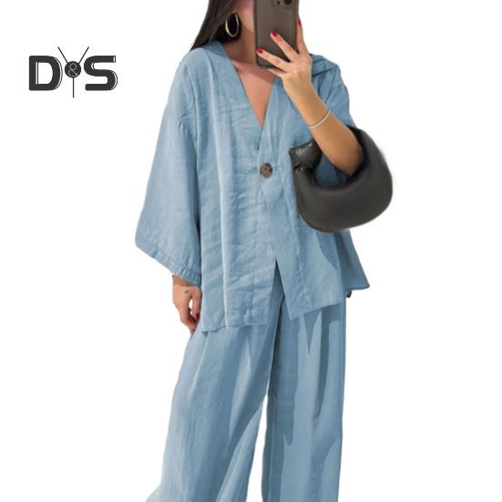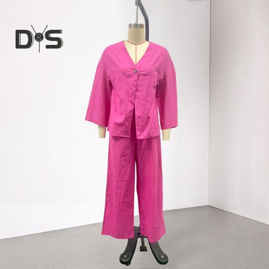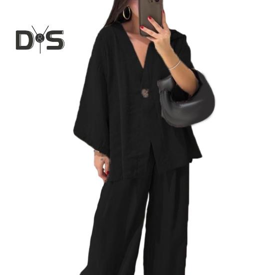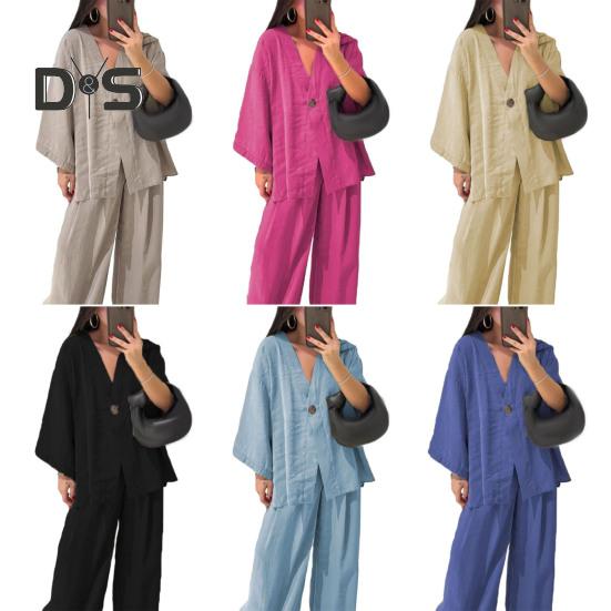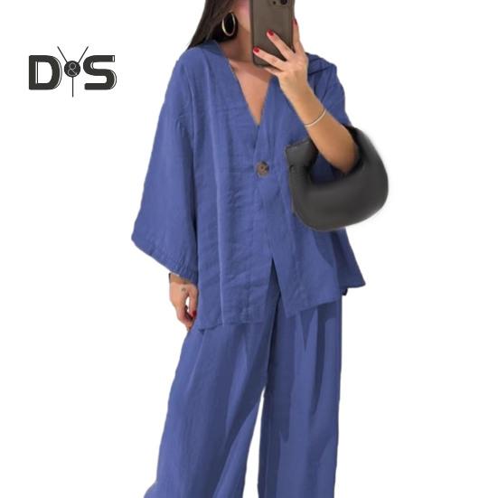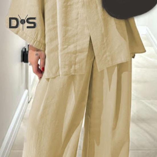 Этот стильный комплект из двух предметов изготовлен из дышащей хлопчатобумажной ткани, обеспечивающей комфорт и стиль в любое время года.. В комплект входит универсальный топ с длинными рукавами и широкие брюки, идеально подходящие для повседневной носки.. Его простой однотонный дизайн подходит для людей разной комплекции и возраста, демонстрируя повседневный, но в то же время шикарный образ..