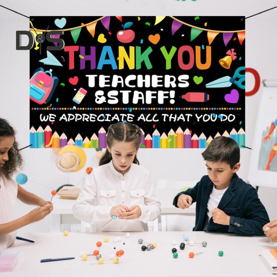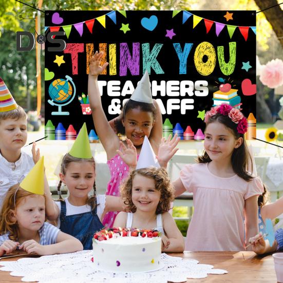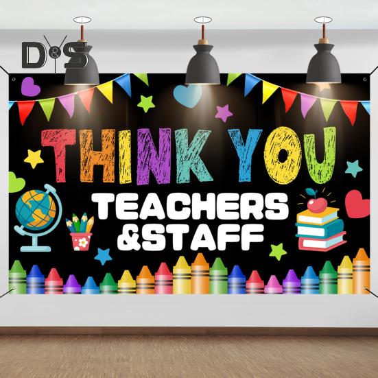 Покажите признательность и уважение учителям с помощью этого прочного и многоразового баннера-фона.. Изготовленный из высококачественной полиэфирной ткани, этот баннер легкий, не мнется и устойчив к погодным условиям и подходит как для внутреннего, так и для наружного использования.. Яркий дизайн включает в себя жирную фразу «Спасибо учителям и персоналу», фон в стиле классной доски и красочные элементы школьной тематики, такие как книги, карандаши и яблоки.