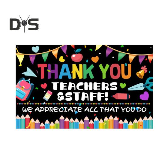 Прочный и многоразовой материал: Этот баннер с благодарностью учителям и сотрудникам, изготовленный из высококачественной полиэфирной ткани, легкий, не мнется и не рвется, что обеспечивает его длительное использование как в помещении, так и на улице.