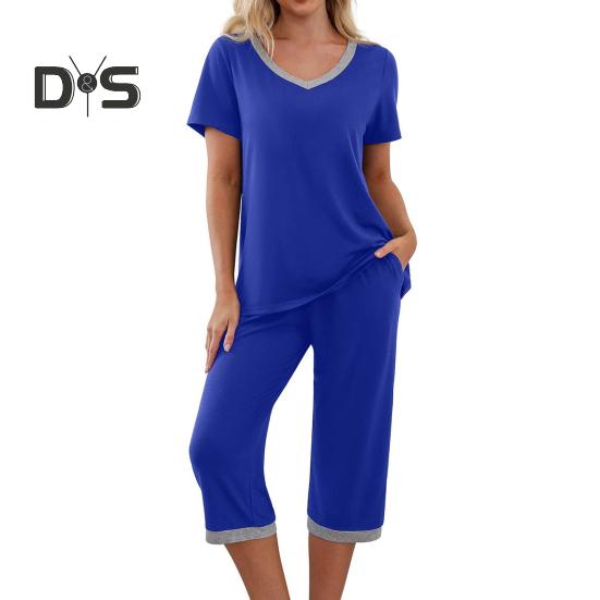 Побалуйте себя максимальным комфортом и стилем с нашим модным однотонным пижамным комплектом. Этот повседневный ансамбль отличается широкими штанинами и свободным кроем, создающим непринужденную атмосферу.. В комплект входит футболка с V-образным вырезом и короткими рукавами, а также брюки. Оба изделия украшены шикарным дизайном, что придает им вневременную привлекательность.. Эти пижамы, изготовленные из легкого, дышащего и мягкого материала, обеспечивают непревзойденный комфорт для отдыха дома или спокойного ночного сна..