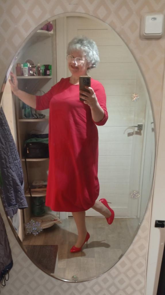 На мои параметры ог 102, от 90, об 104 село хорошо. И не мешком, и не в обтяг. Боковые фалды смотрятся не как на картинке, поскромнее так. Ткань меня устроила- лен с хлопком+ синтетические нити( по моим ощущениям). Цвет отличный- красиво красный, я люблю такой! В целом платьем довольна. Еще и сережки в подарок приложили( внучке отдам) Швы обработаны хорошо, это важно. Брала размер xxl