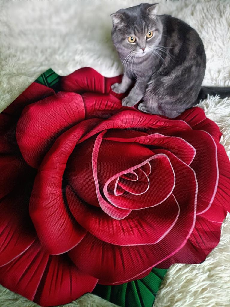Яркий красивый коврик🌹 Очень необычно выглядит! Рисунок на нем 3D, лепестки как живые ! Как будто выпуклые- судите сами. С обратной стороны коврик чёрный, и на нём сделаны резиновые пупырышки. Так что он не скользит, лежит так как вы его положили. Пришел в узком пакетике, свёрнутый трубочкой. Легко расправился. Котикам моим коврик понравился, мне и дочке тоже. Заказала ей такой же, другого цвета.
