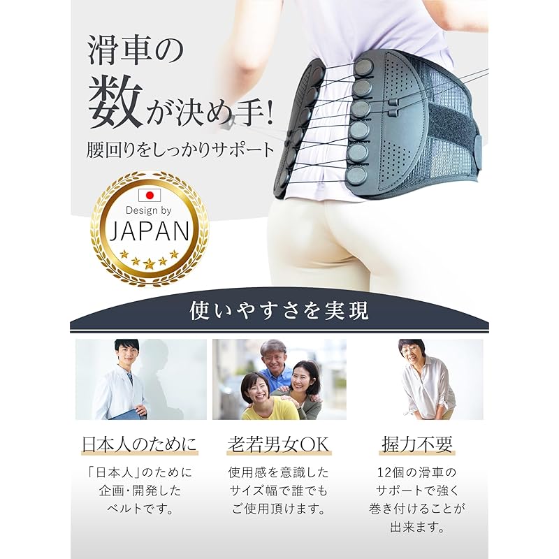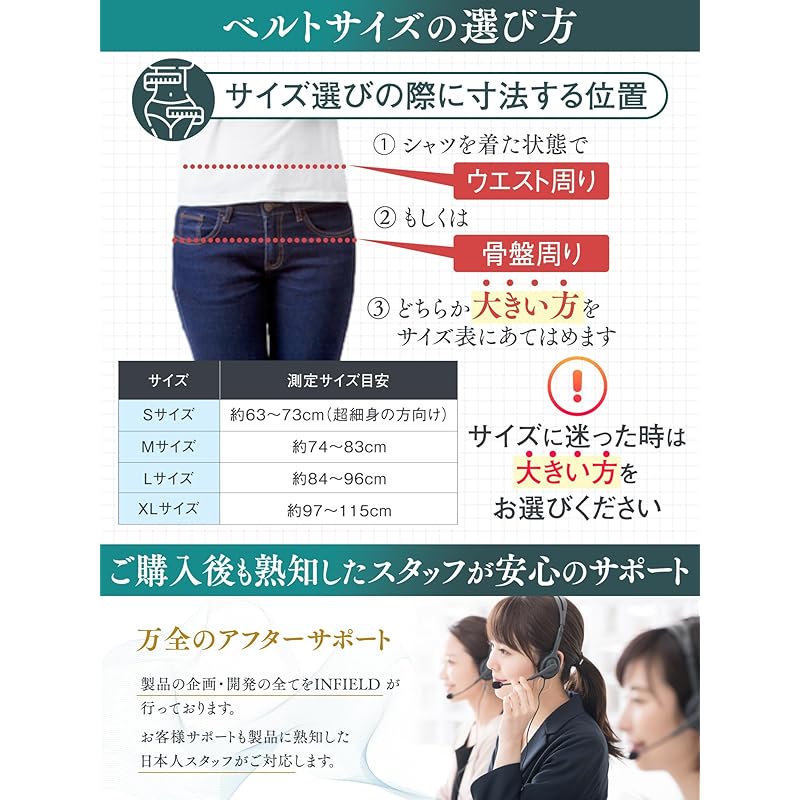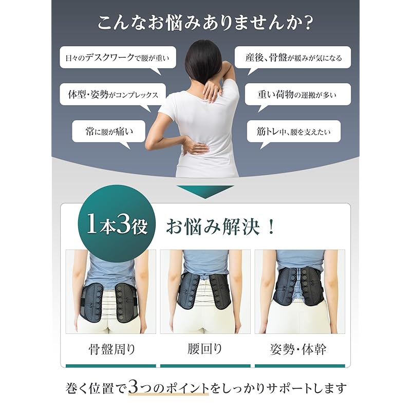 [Belt born from customer feedback] We first listened to the real voices of our 1,000 most important customers, and planned and developed this belt for Japanese people.By using this belt for pelvic correction and lower back pain prevention, it stabilizes the pelvis and keeps the lower body in the correct position, helping maintain good posture and helping to improve and prevent various lower back problems.Recommended for those who suffer from stiff shoulders and headaches caused by long hours of desk work.By tightening your stomach with the belt, it helps you build a slim body and supports your diet.In addition, by lifting the internal organs, it also contributes to beautiful skin and maintaining your style.