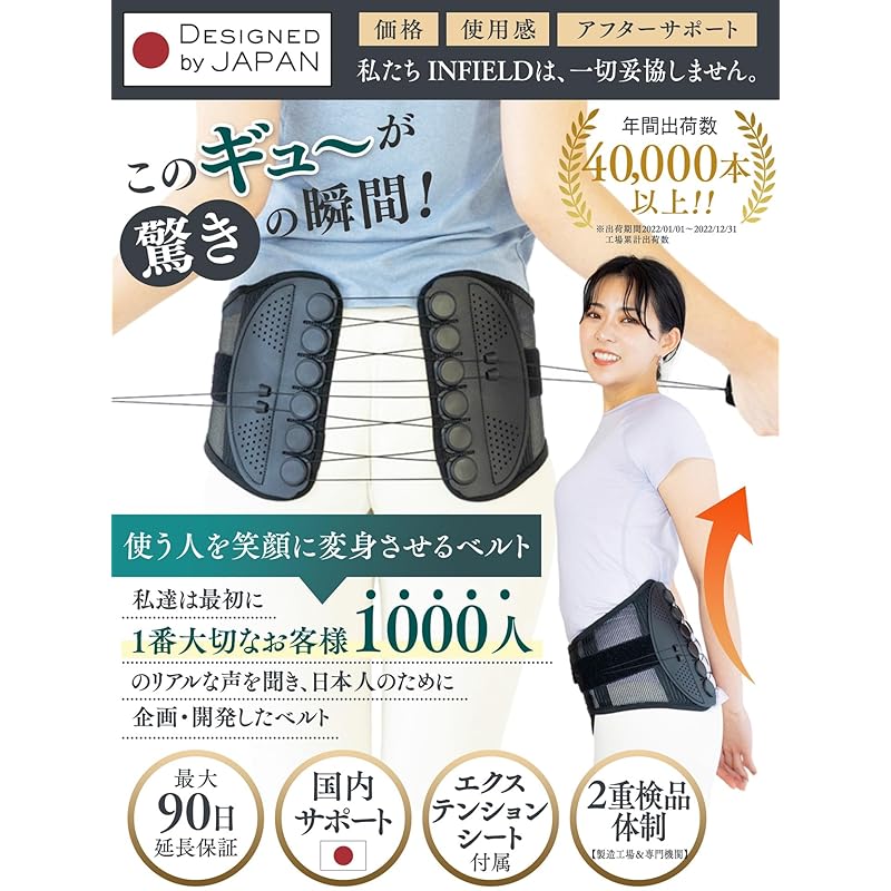 [INFIELD's commitment] ① Emphasis on fixing power: 10 pulleys are installed.By doing this, even people with limited strength can wrap the rope firmly and tightly.② 3D plate designed based on ergonomics: It tightens firmly with little force and has a structure that provides natural support, so it feels like it's custom-made! Firmly supports the lower back from the lumbar vertebrae to the pelvisIt is a wide type.③ Excellent breathability: Made of mesh material throughout so you can wear it all year round, it has good breathability and won't get stuffy even if you wear it for a long time, so you can use it regardless of the season.④ Strong sling: Our slings are specially processed and can be used without any problems even when pulled with all your strength.