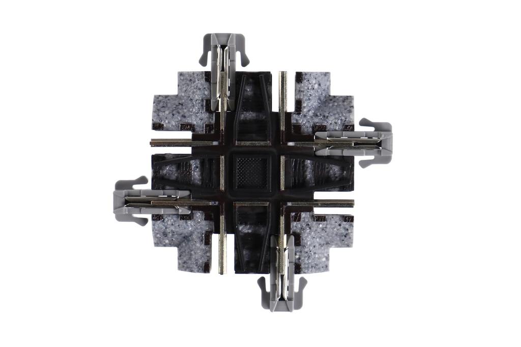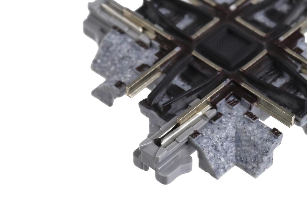 Ортогональная перекрестная линия стандарта системы Unitrack. Подходит для воспроизведения макетов в форме восьмерки, линий обслуживания фабрик, линий гавани и макетов в форме Америки.. Поскольку каждый пересекающийся рельс электрически независим, для самого пересекающегося пути не требуется специальной электропроводки или изоляции.. Кроме того, рельсы на неэлектрифицированных участках сделаны максимально короткими, чтобы транспортным средствам было легче беспрепятственно проходить по ним.