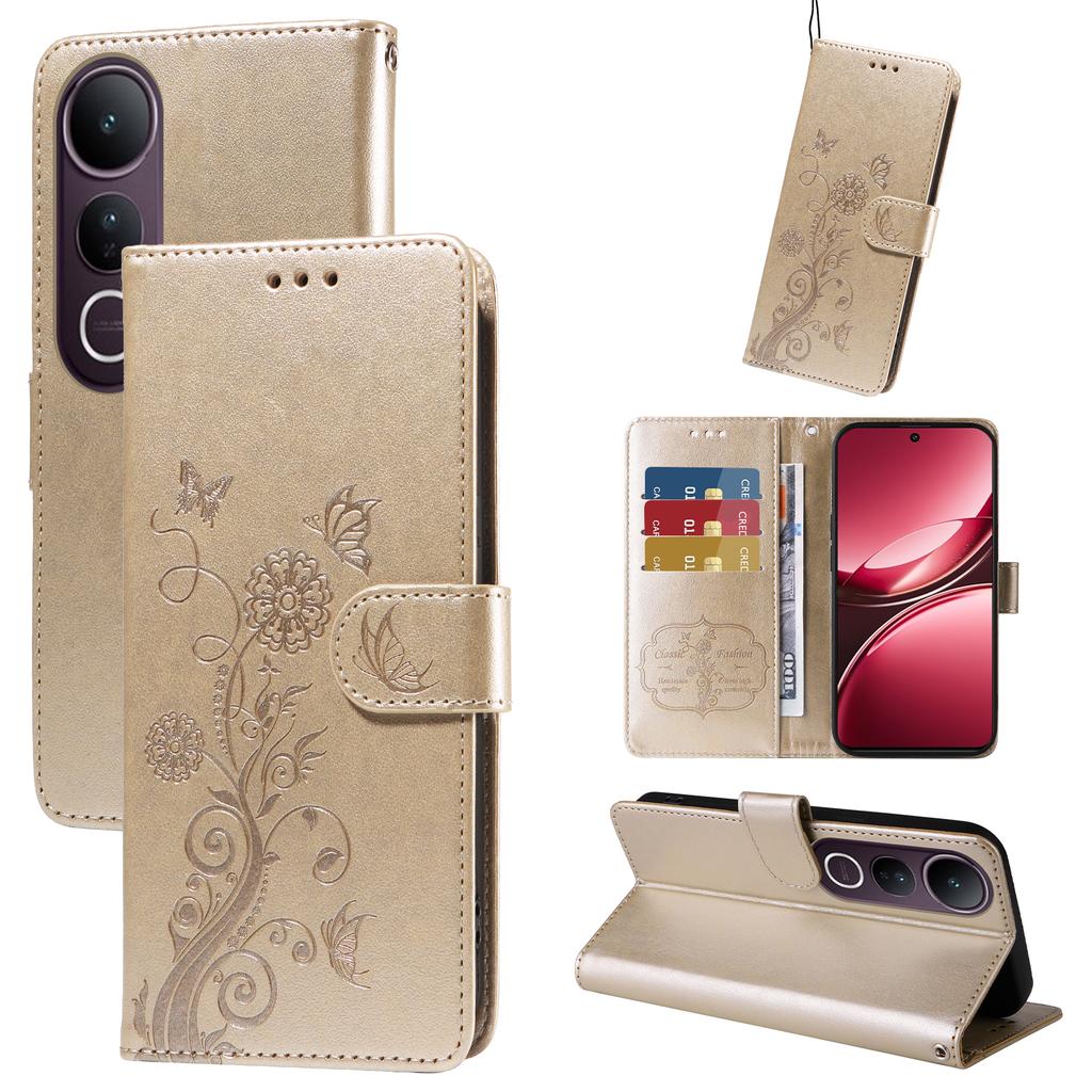 Для vivo V50 Lite 5G Кожаный чехол Бабочка Цветочный оттиск Кошелек Подставка Обложка