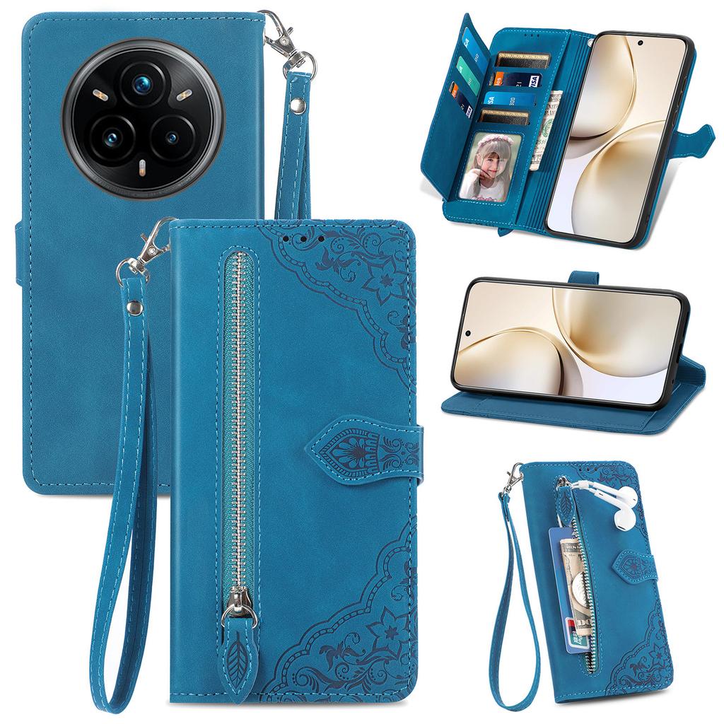 For Realme 14 Pro+ 5G Zipper Wallet Case with Strap Flower Imprint PU Leather Phone Cover