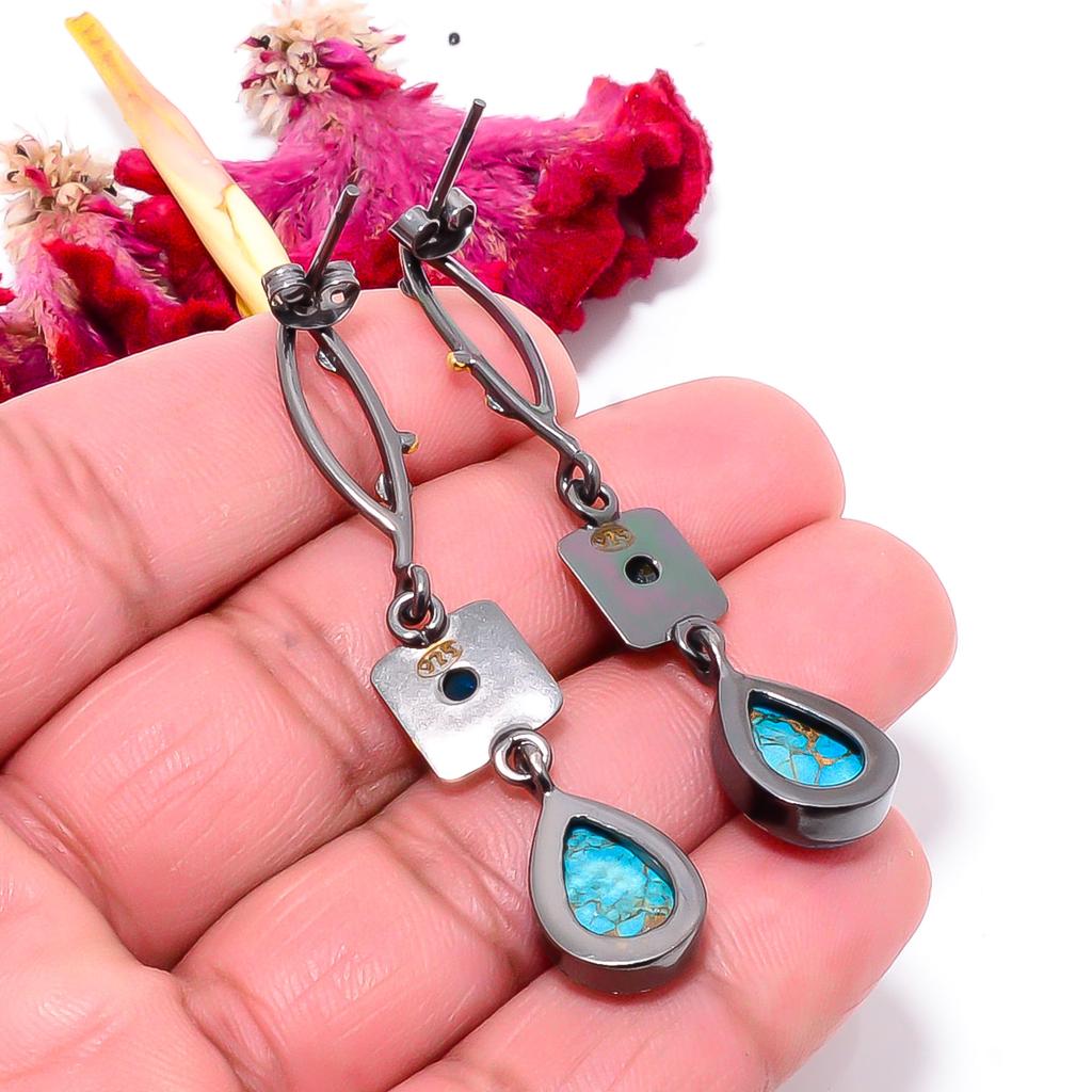 Медь Синяя Бирюза и Голубой Топаз Серебро 925 пробы Покрытые Черным и Золотым Родием Серьга 2,34" Sku19, Синяя Серьга, Серьга с Натуральным Драгоценным Камнем