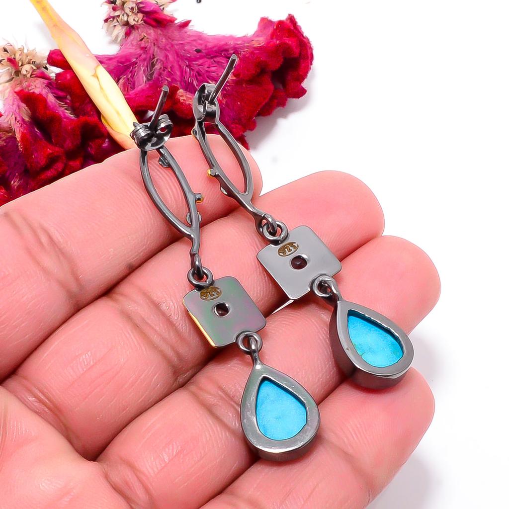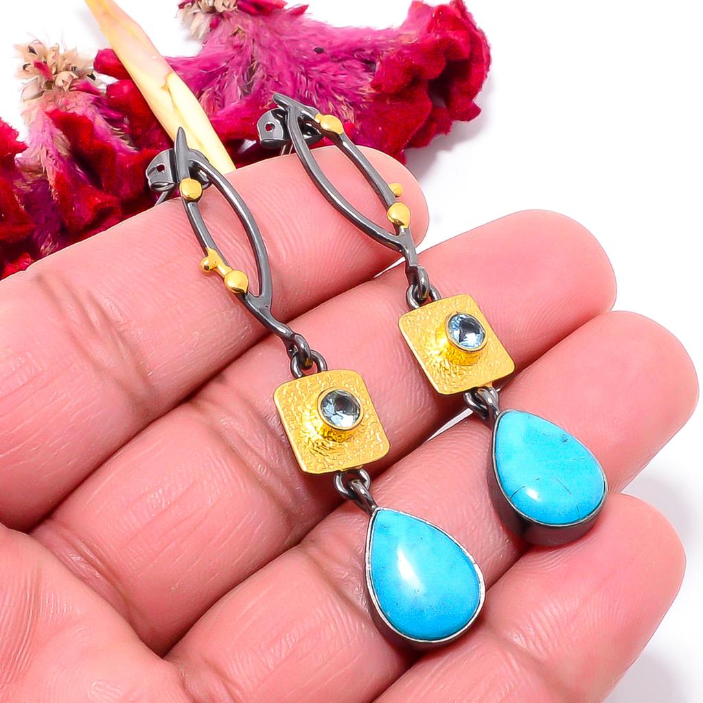 Магнезит Бирюза и Голубой Топаз Серебро 925 пробы Покрытие черным и золотым родием Серьга 2,34" Sku20, Синяя серьга, Серьга с натуральным драгоценным камнем