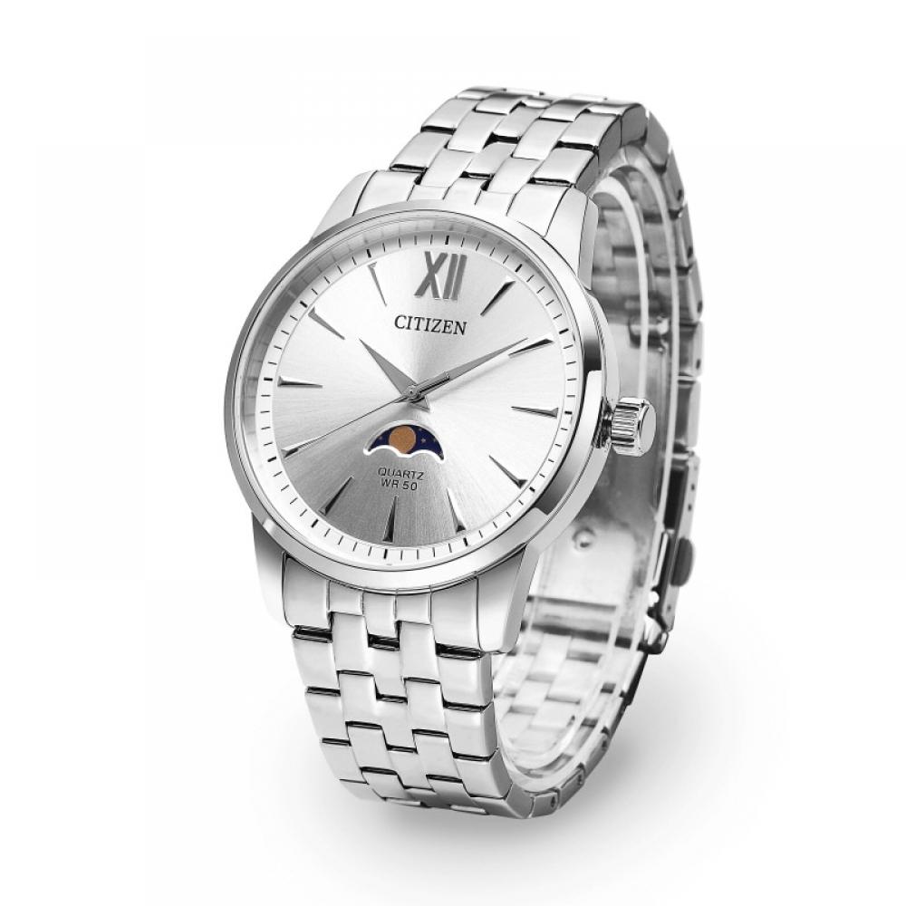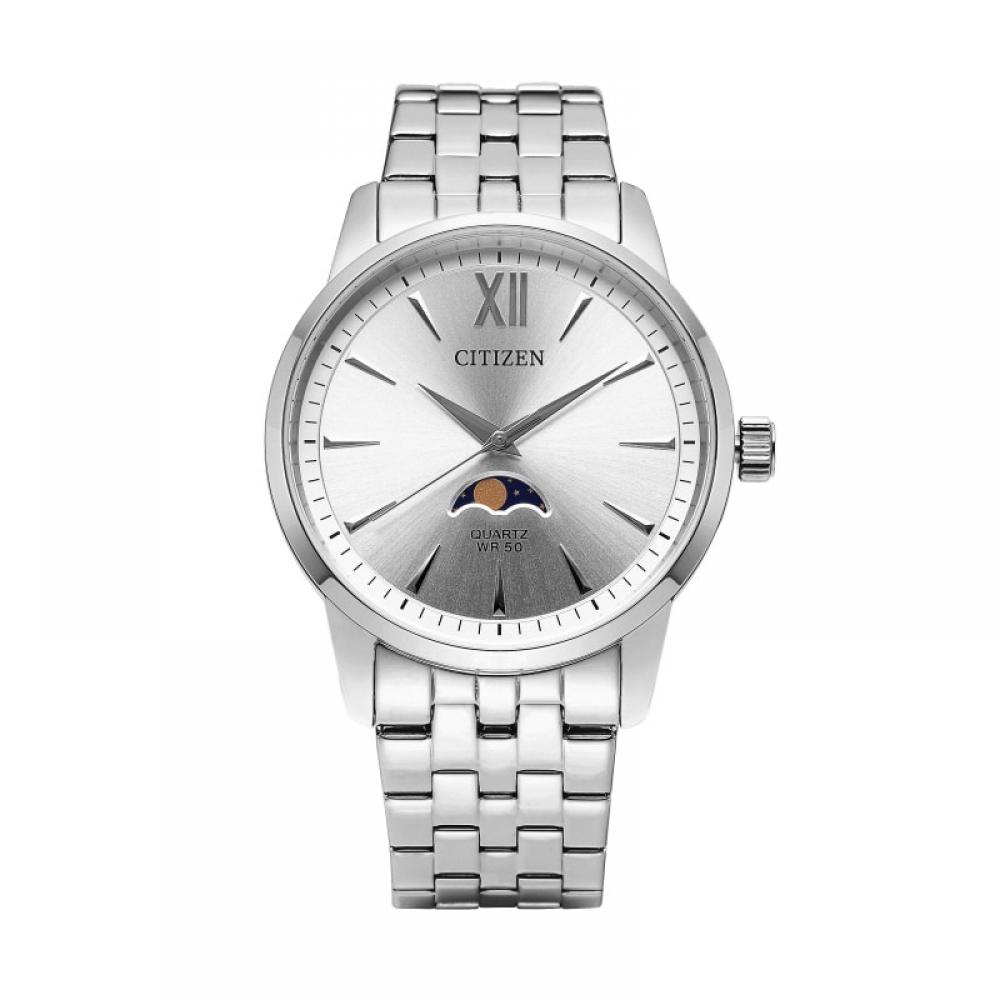 Мужские металлические часы CITIZEN AK5000-54A Moon Phase изготовлены из нержавеющей стали, что обеспечивает их исключительную долговечность, а белый циферблат добавляет элегантности.. Часы имеют корпус толщиной 14 мм и диаметром 42 мм, а также водонепроницаемость 5 АТМ.. Помимо отображения часов, минут и секунд, они также оснащены уникальной функцией фазы Луны.
