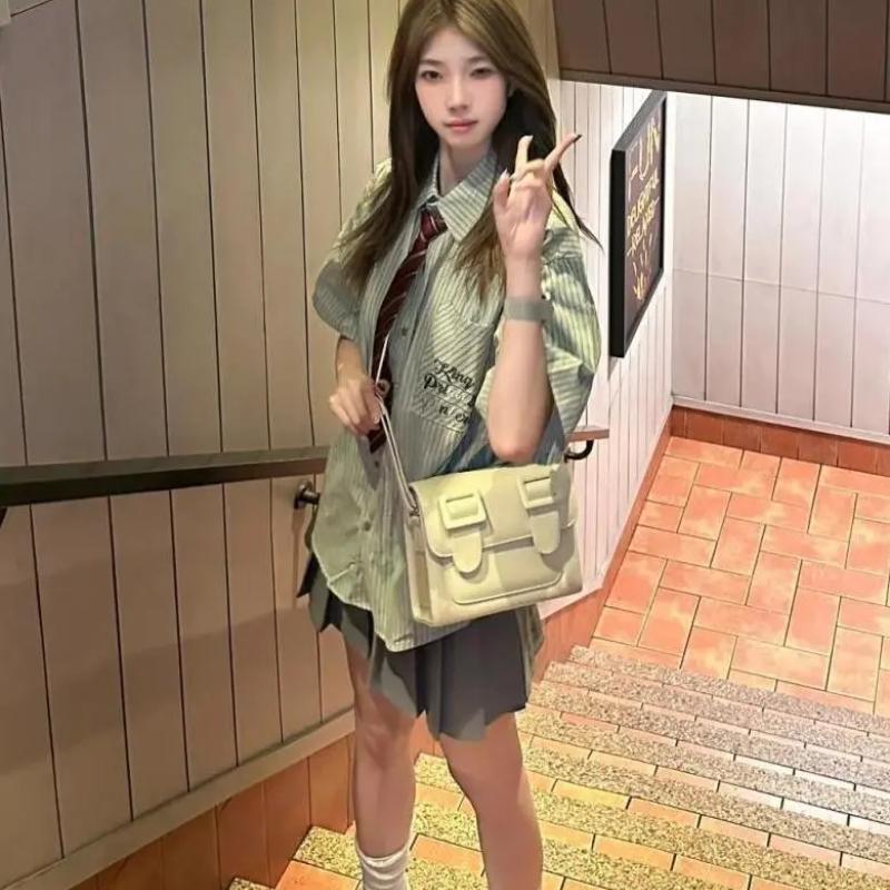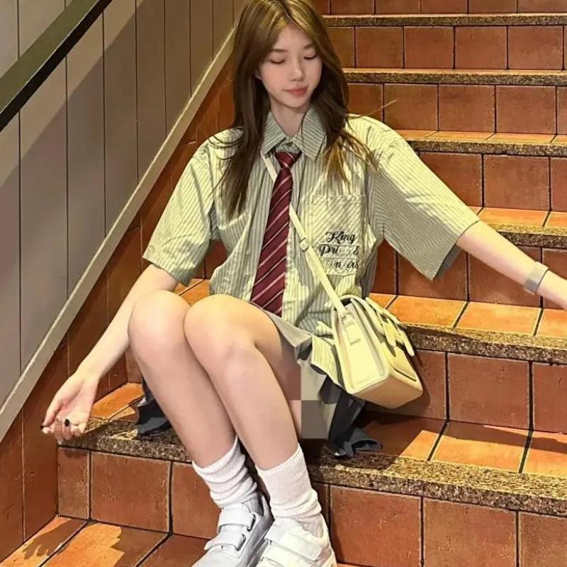 Ретро летняя старинная зеленая полосатая рубашка женская с короткими рукавами японский свободный повседневный костюм в стиле колледжа с короткой юбкой