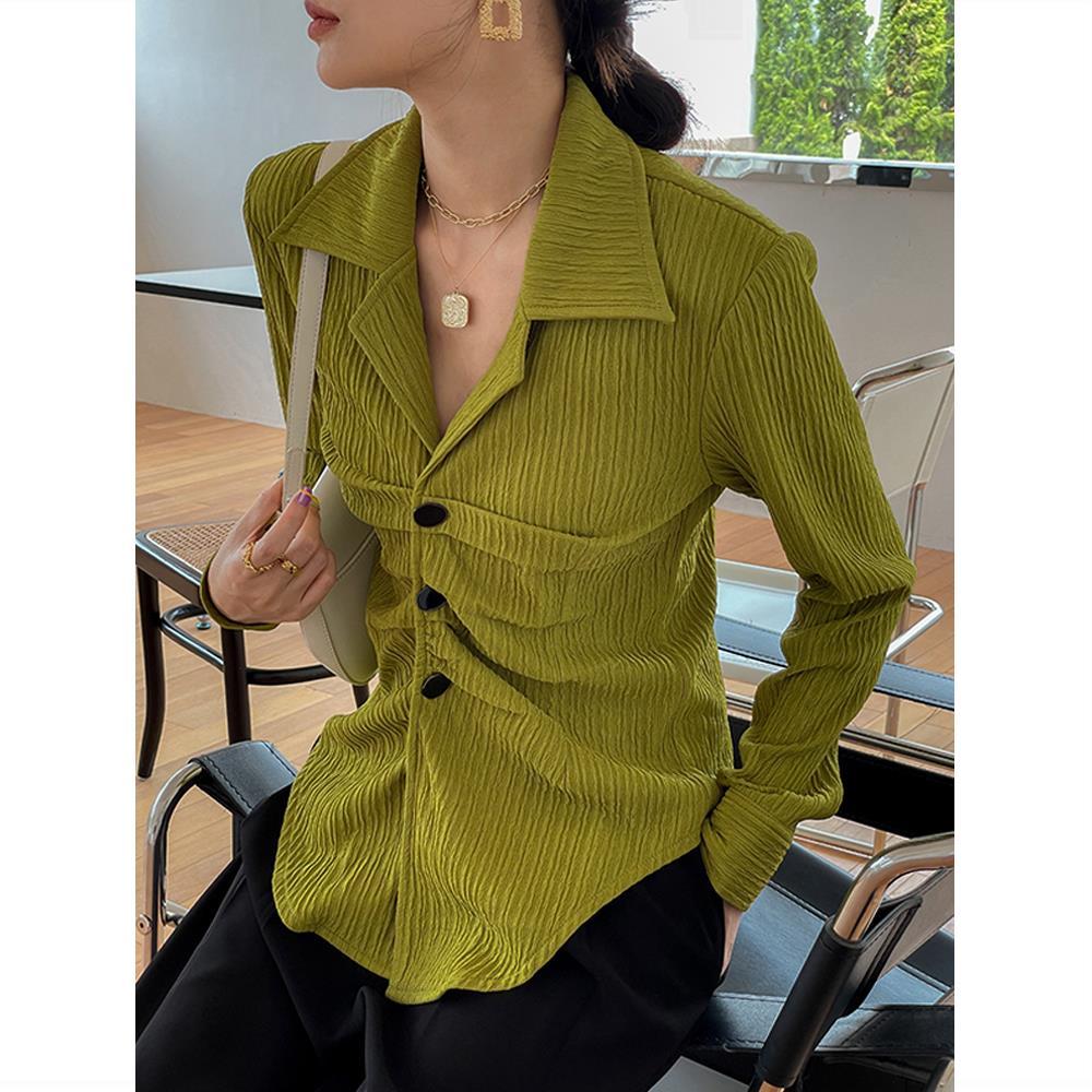 Ретро Текстура Плиссированная рубашка горчичного цвета Свободный стиль Гонконга V-образный вырез лацкан Топ Ранняя осень Новый