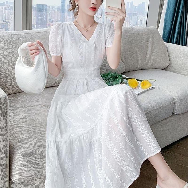 Летние новые чистые хлопковые V-образные вырезы с вышивкой элегантные модные белые платья женские с коротким рукавом талии милое платье-халат женское платье Vestido