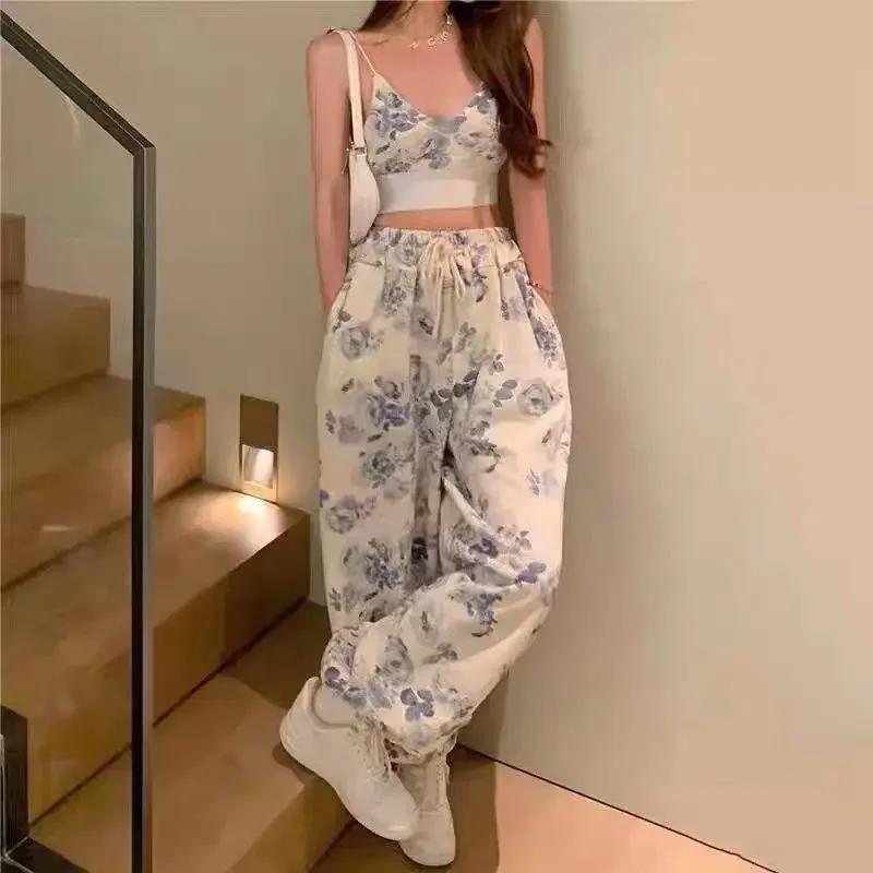 Корейские комплекты из 2 предметов, женская летняя одежда, цветочная майка с V-образным вырезом на тонких бретельках и брюки с эластичной резинкой на талии