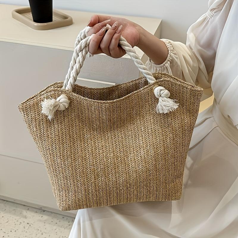 Плетеная сумка-тоут в стиле бохо-шик - Большая вместимость, легкая наплечная сумка с двойными веревочными ручками и декоративными узлами для пляжа — купить товар онлайн с бесплатной доставкой по всему миру!