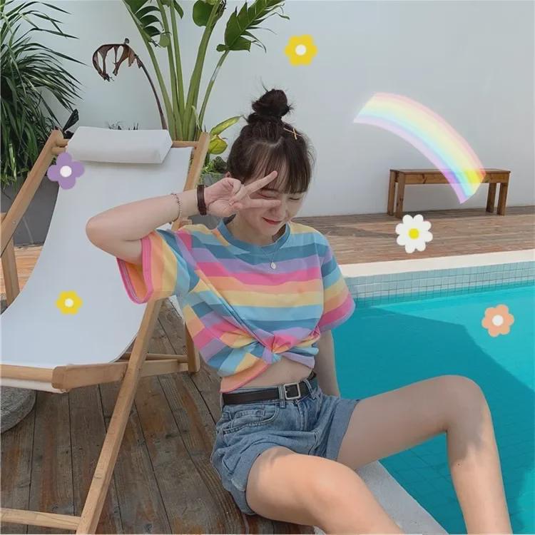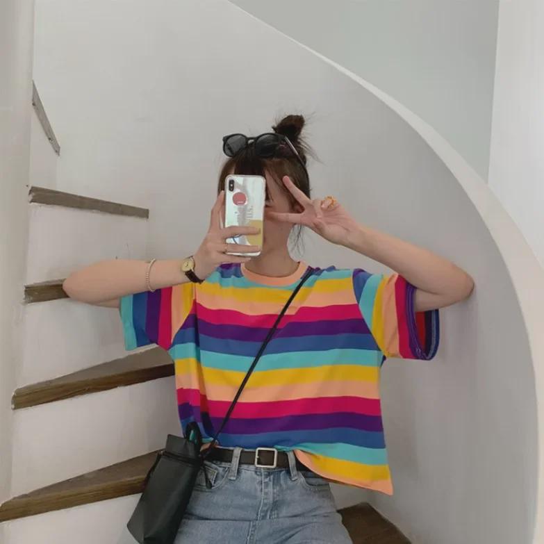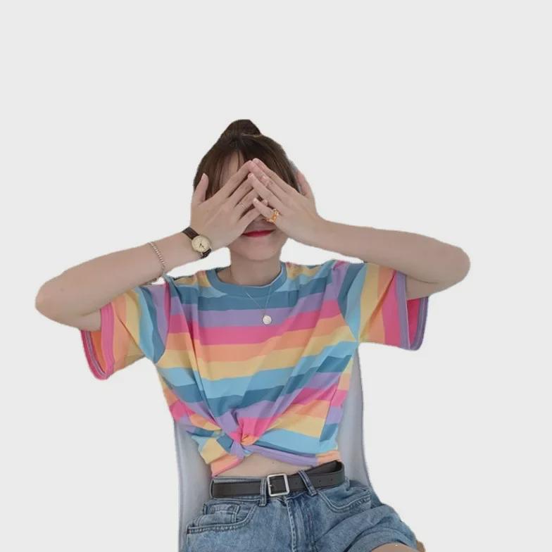 Этот женский укороченный топ в полоску станет стильным дополнением к вашему летнему гардеробу, воплощая корейский стиль 2021 года благодаря свободному крою и современному дизайну.. Изготовлен из мягкой хлопковой смеси, обеспечивает комфорт и воздухопроницаемость.. Верх украшен шикарным принтом, имеет короткие рукава и круглый вырез, что делает его идеальным для повседневных прогулок и теплых дней.