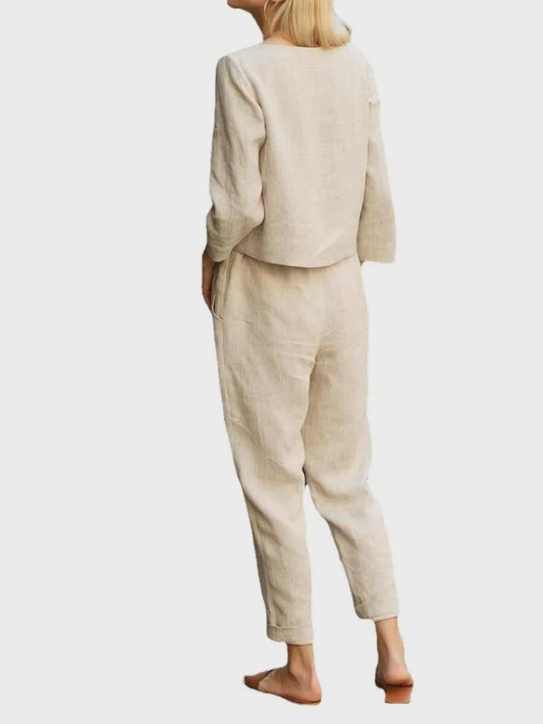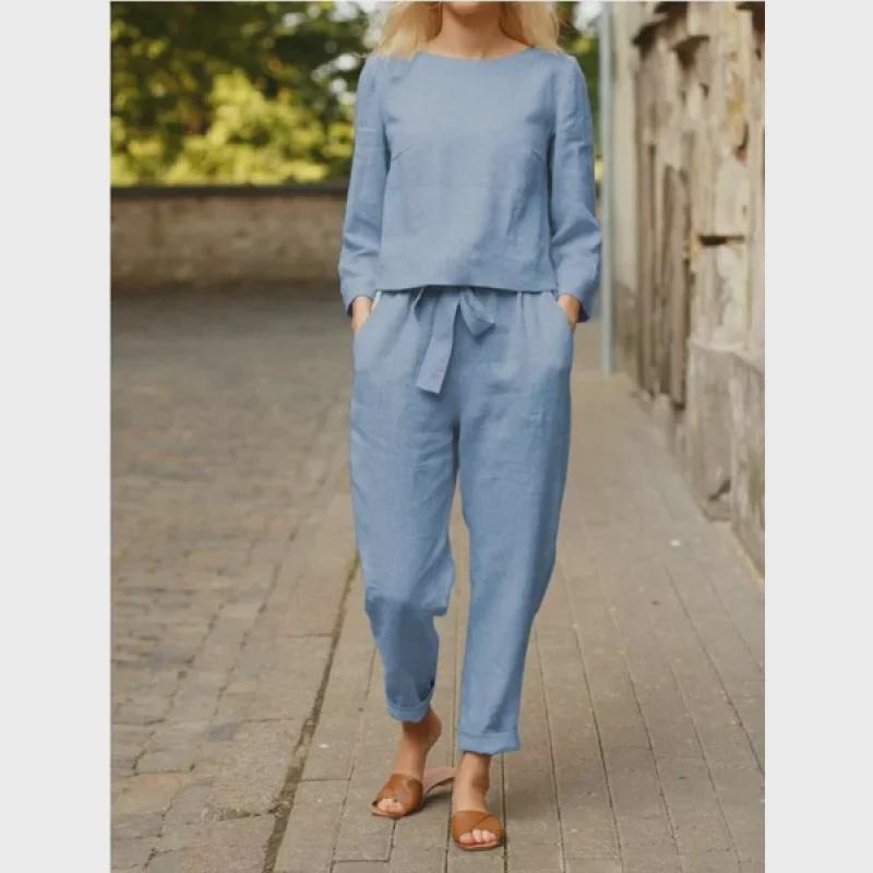 Ощутите суть непринужденного стиля с этим женским осенним ансамблем.. В комплект входит повседневный топ и соответствующие брюки. Оба изделия изготовлены из высококачественных материалов, обеспечивающих комфорт и долговечность.. Этот наряд, выполненный в однотонных тонах, идеально подходит для создания универсального образа, независимо от того, отдыхаете ли вы дома или выходите на улицу в неформальной обстановке.. Минималистская эстетика гарантирует, что он будет идеально сочетаться с вашими любимыми аксессуарами, что сделает его неотъемлемой частью вашего сезонного гардероба.