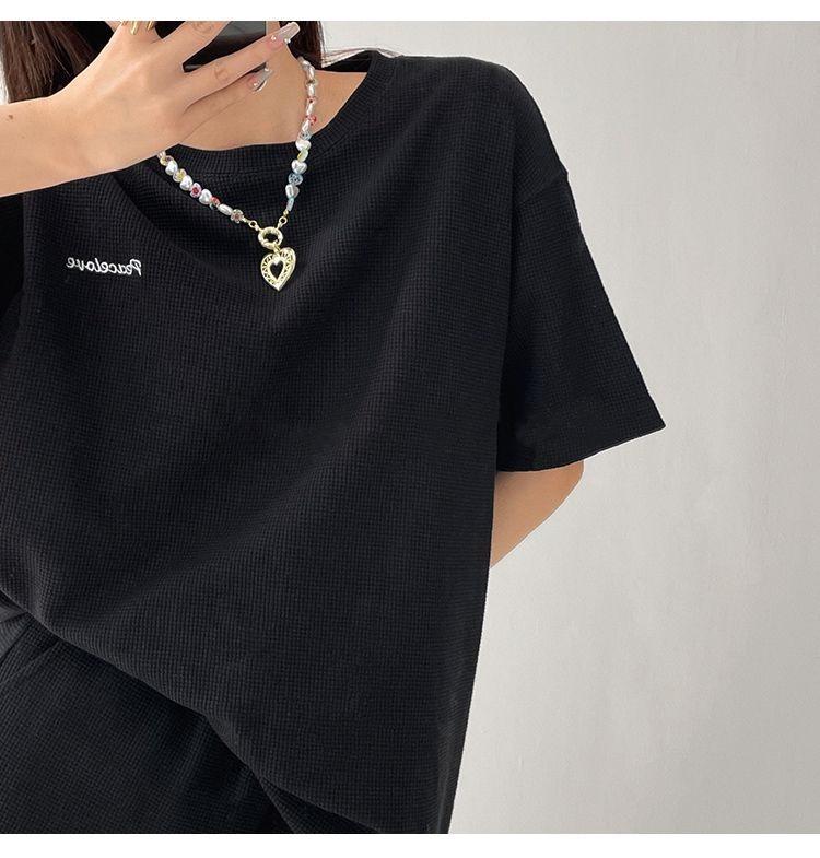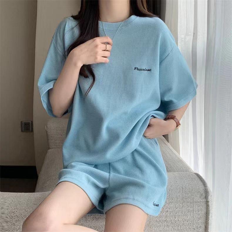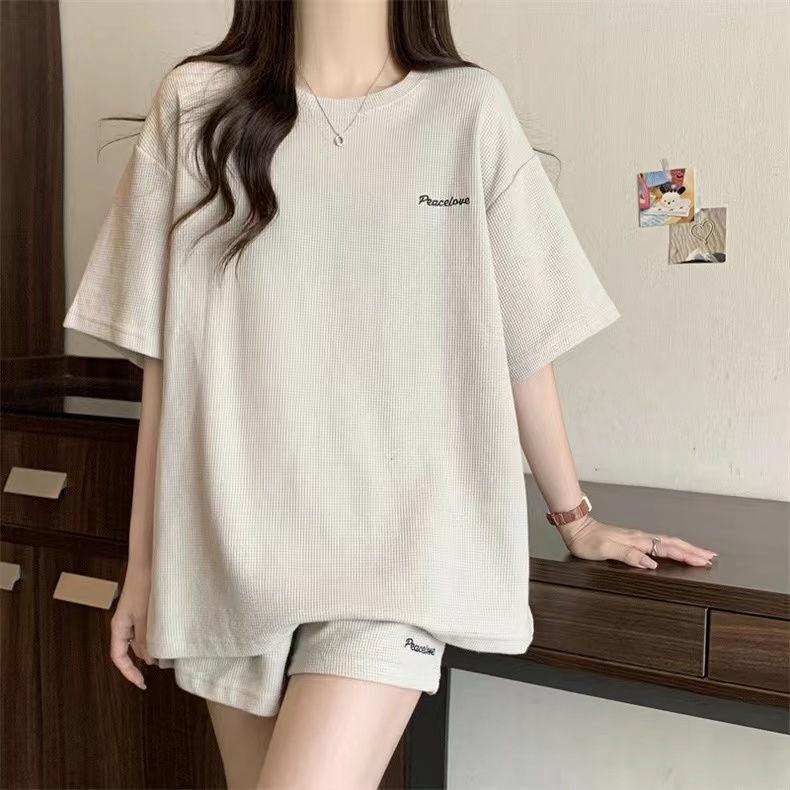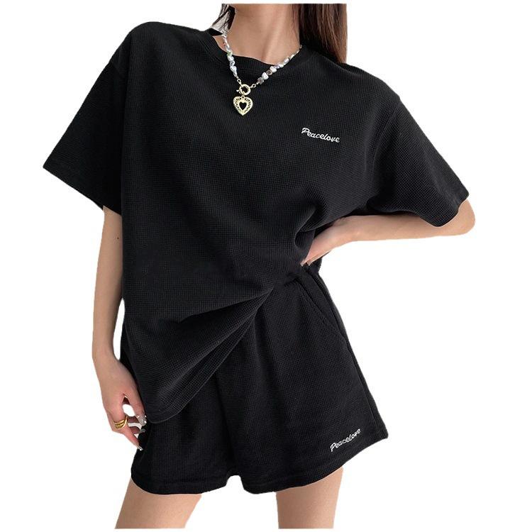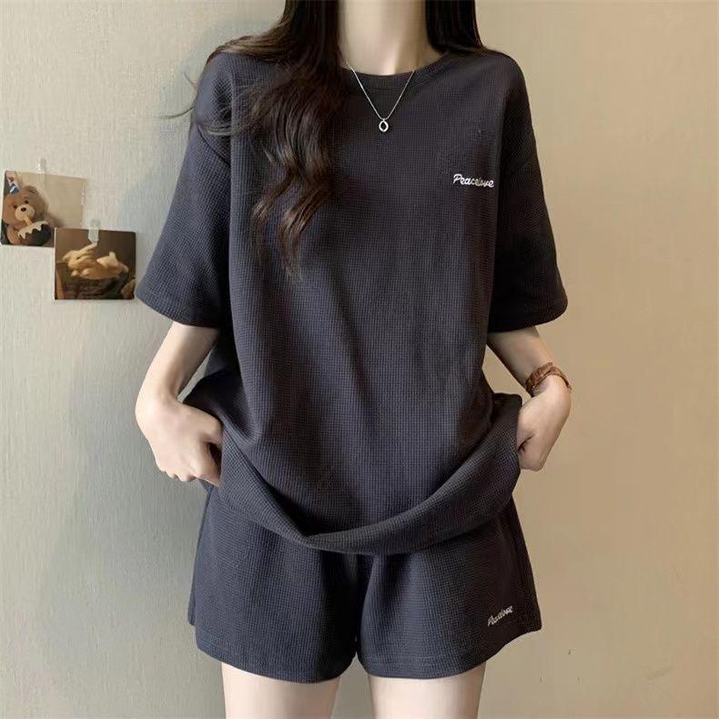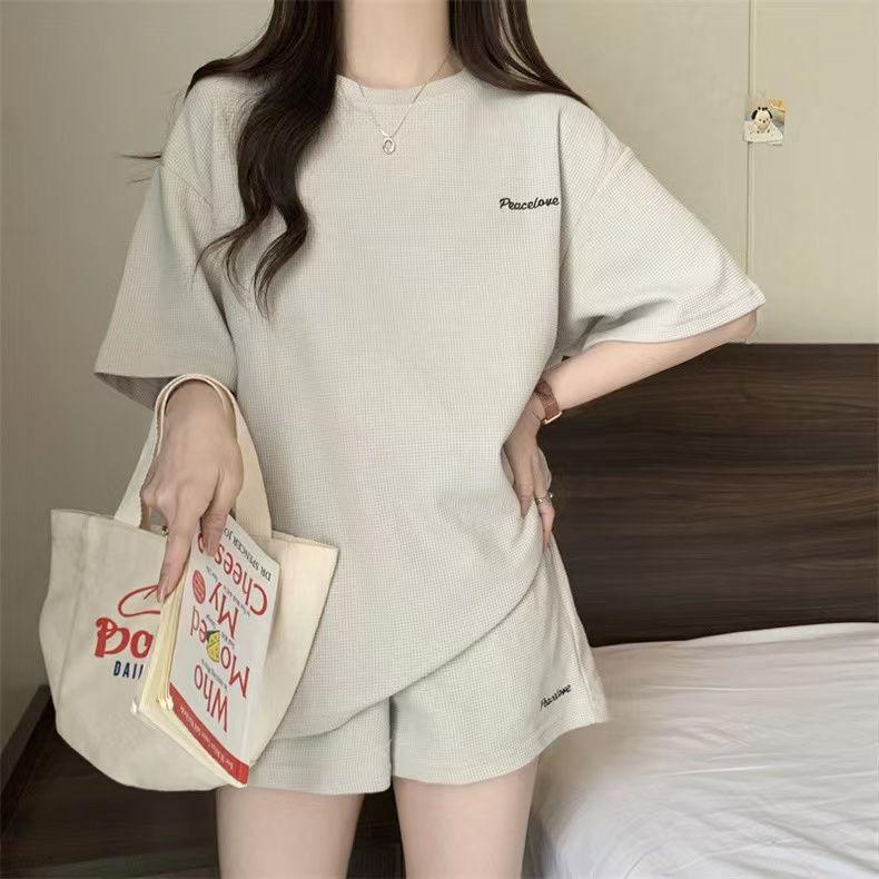 Женский летний спортивный костюм в корейском стиле - свободная вафельная трикотажная футболка и шорты, комплект из двух предметов