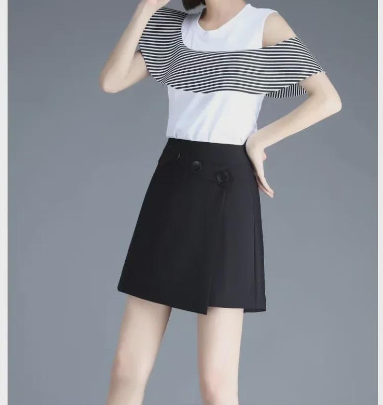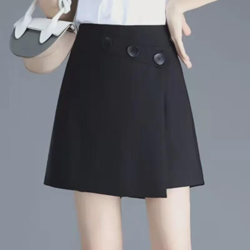 Женские черные шорты с высокой талией: Корейский стиль 2024 Весна/Осень, облегающий А-силуэт, универсальный, свободный крой, широкие штанины.