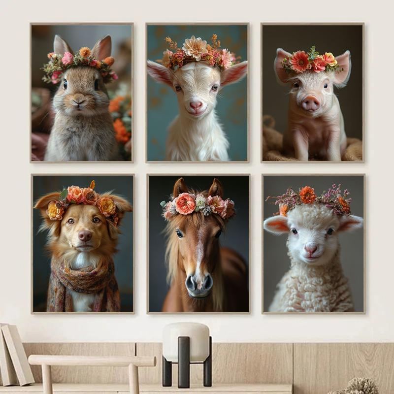 Детские животные кролик коза свинья собака лошадь овца цветок корона холст постеры и принты настенные художественные картины для дома декор детской комнаты