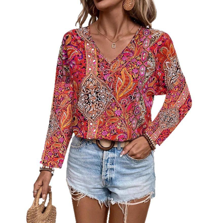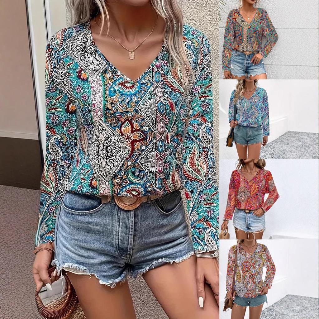 V-образный вырез 3D этнический стиль принтованный топ модные повседневные длинные рукава женские футболки