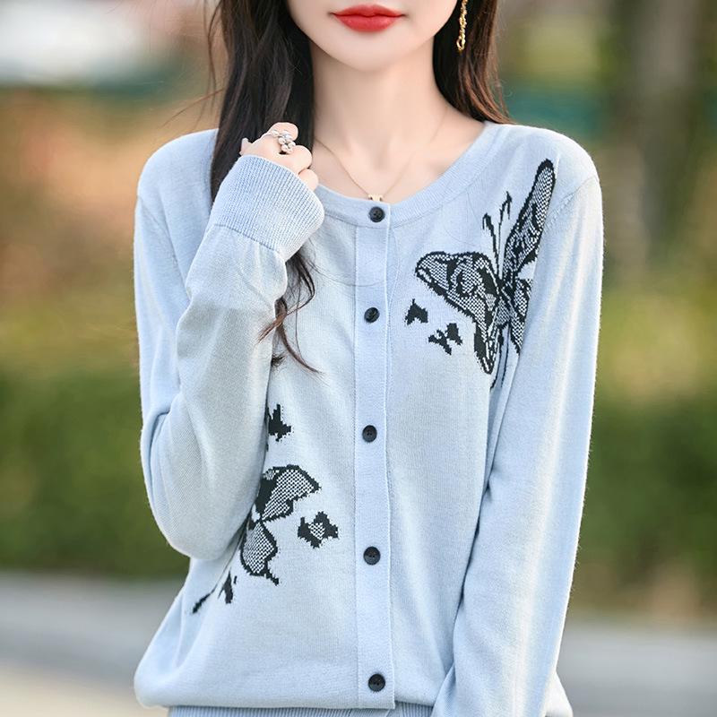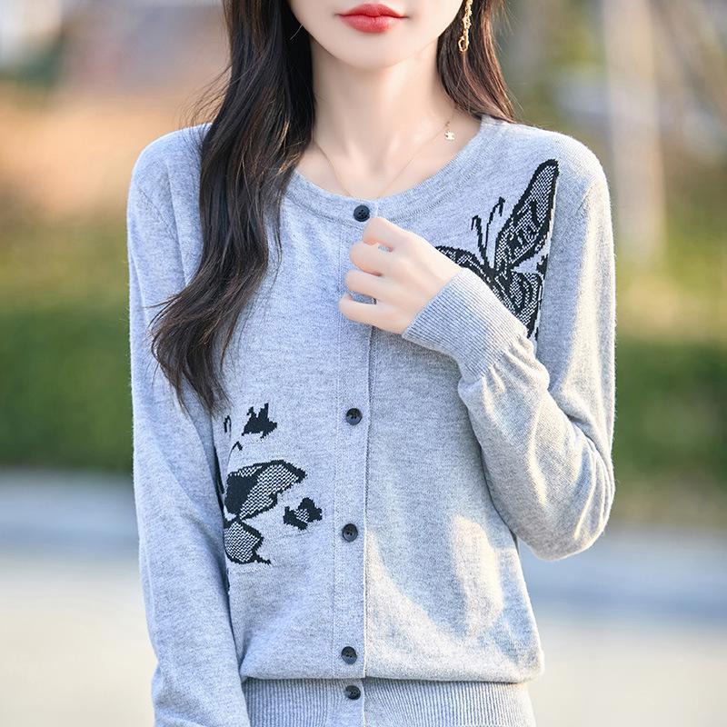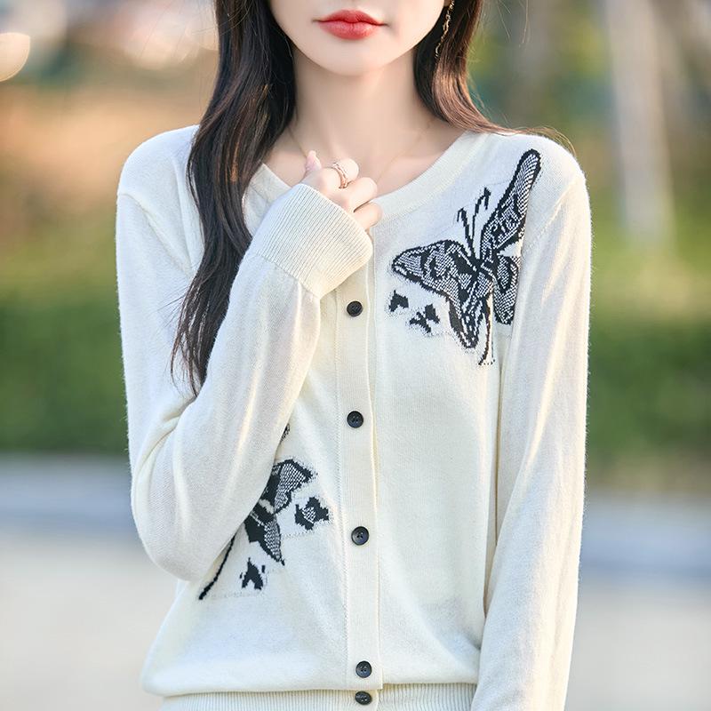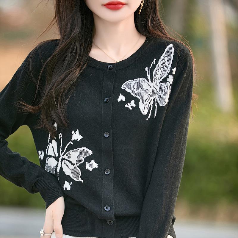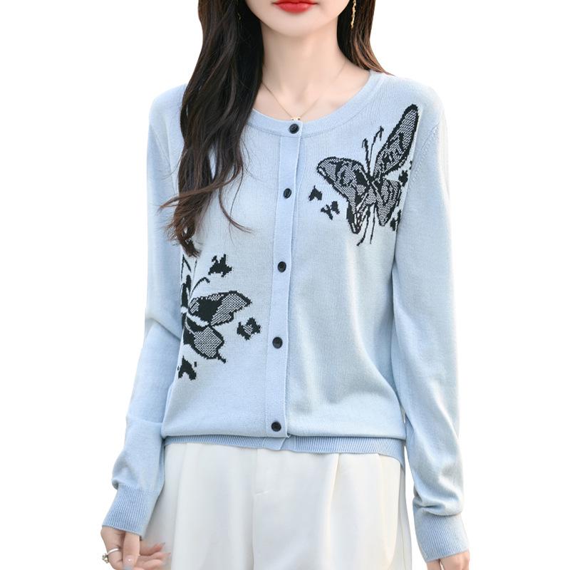Женский шерстяной кардиган с бабочками и интарсией, весна/лето 2025 г. – свободный крой, круглая горловина, длинный рукав