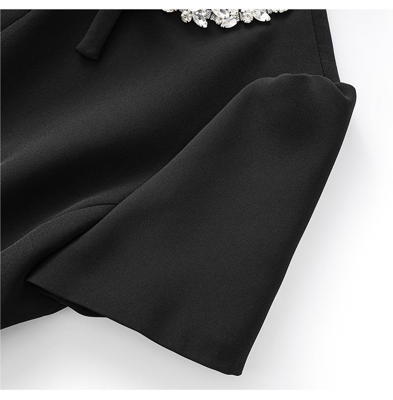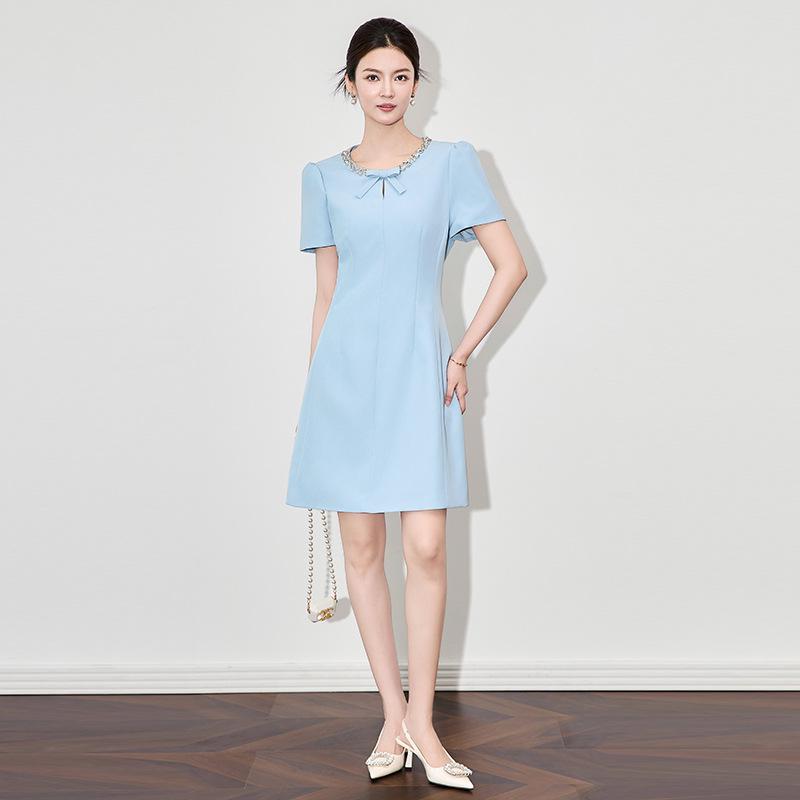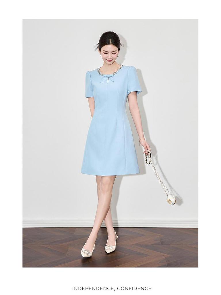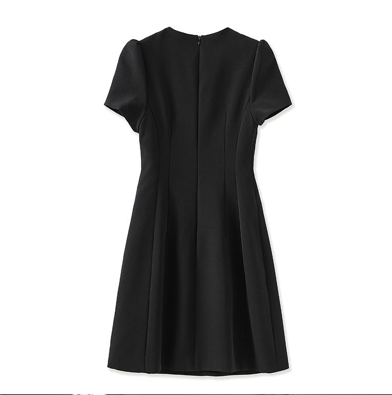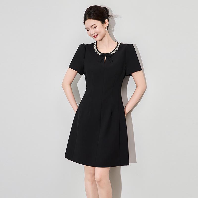 Пополните свой гардероб этим стильным облегающим платьем с короткими рукавами, изготовленным из высококачественного полиэстера для комфорта и долговечности.. Отличительной особенностью этого элегантного платья является его изысканный дизайн воротника с бриллиантами, добавляющий нотку изысканности его вневременному силуэту.. Идеальное для различных случаев, это платье органично сочетает современную моду с классическим шармом.