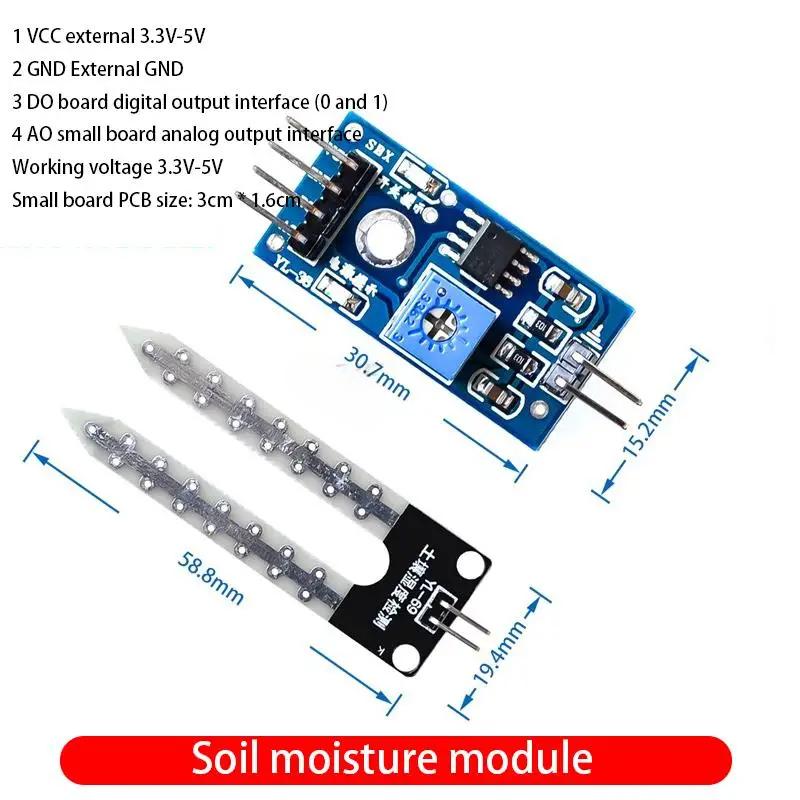 3 Маленький модуль цифрового выхода D0 может быть напрямую подключен к микроконтроллеру, через который обнаруживаются уровни высокого и низкого напряжения, таким образом определяя влажность почвы.;