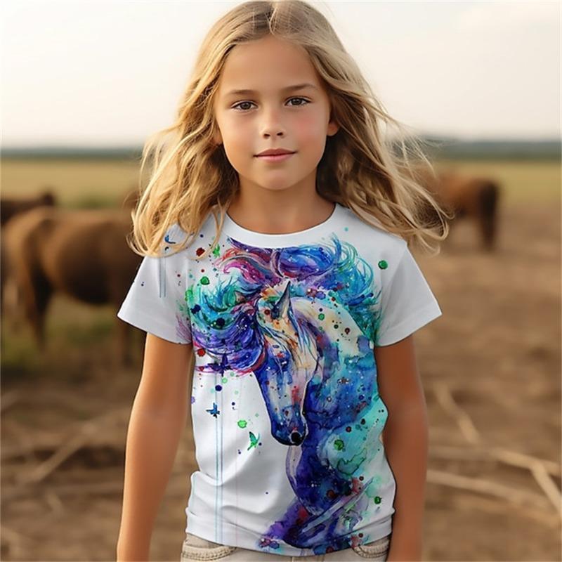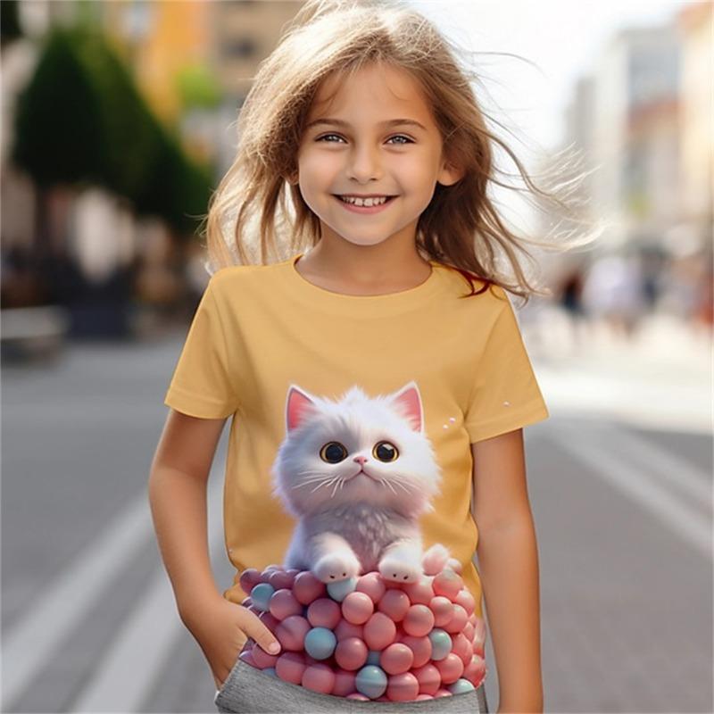 Футболка с изображением кота для детей, топы с коротким рукавом, летняя кавайная модная футболка с изображением лошади, одежда для девочек от 8 до 14 лет, детская футболка