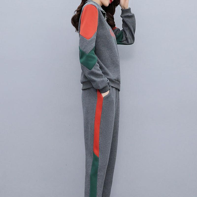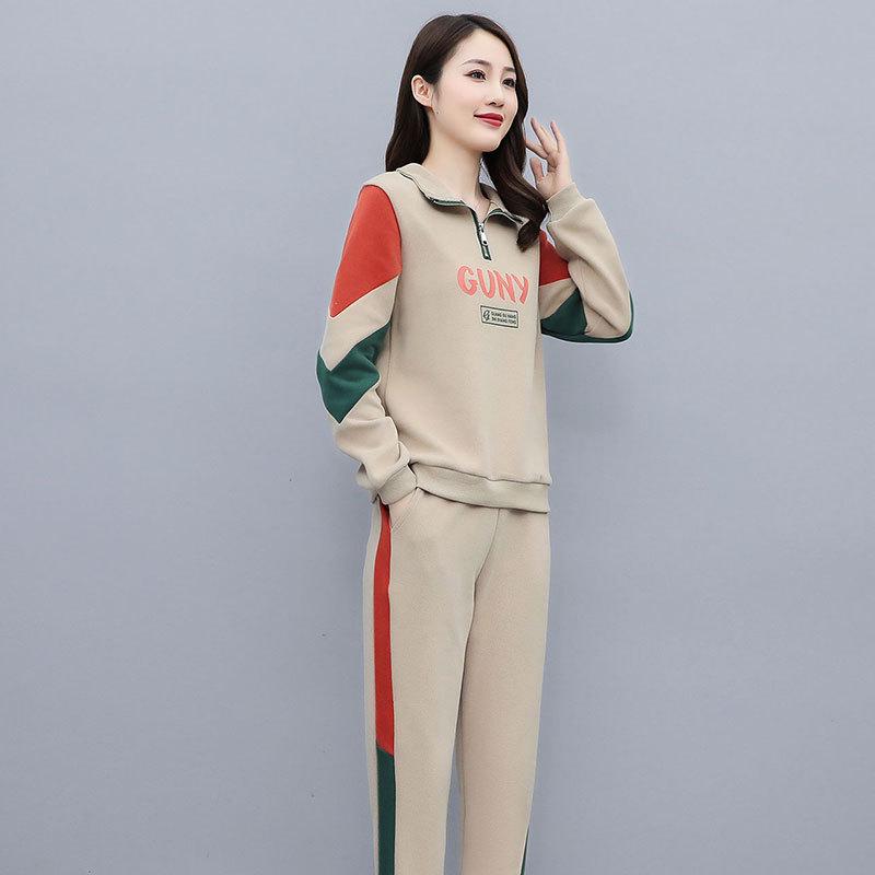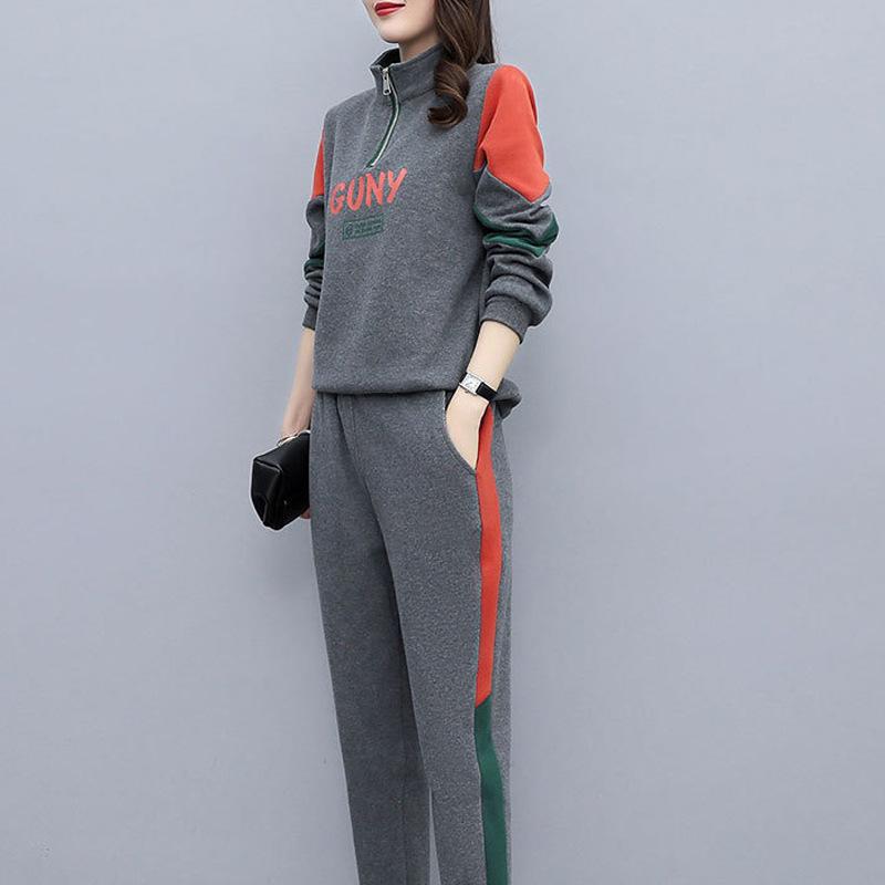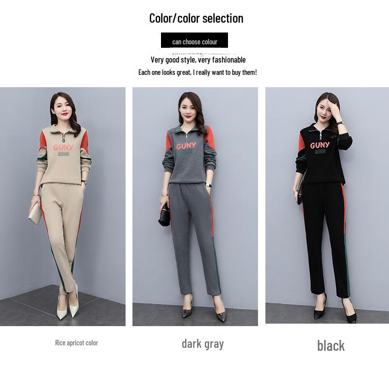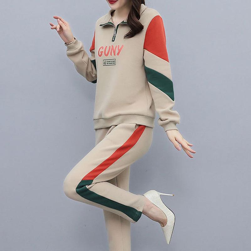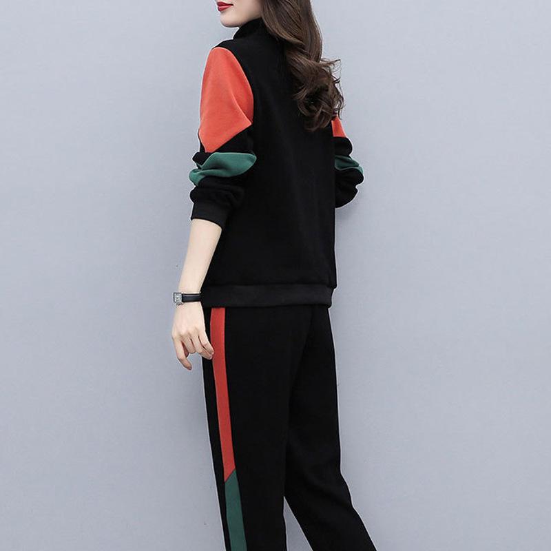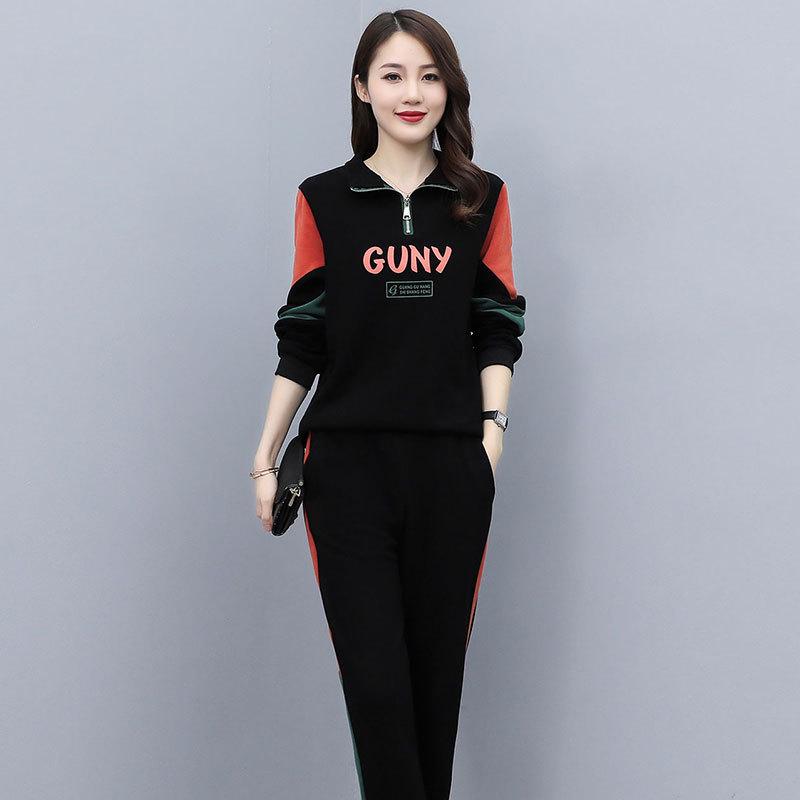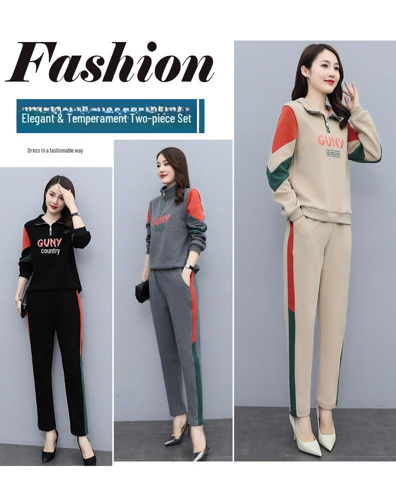 Женский повседневный спортивный костюм весна 2024: Корейский комплект из топа с длинными рукавами и брюк контрастного цвета, лацкана, с буквенным декором.