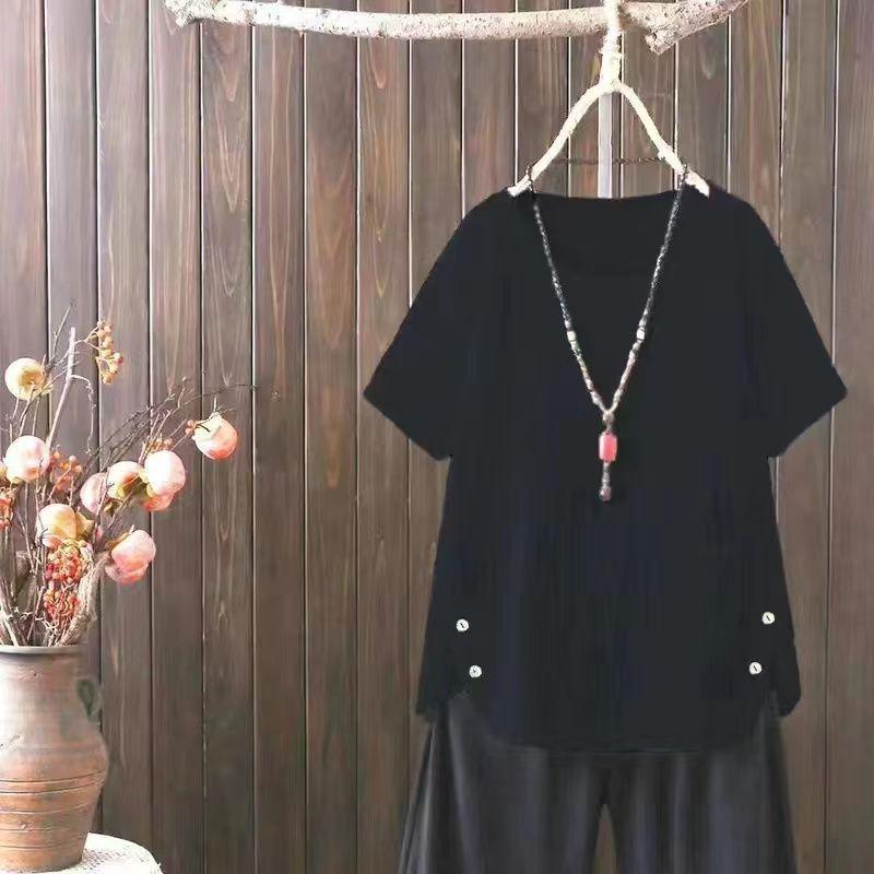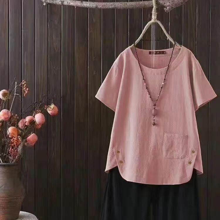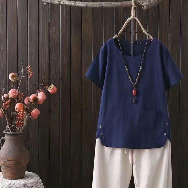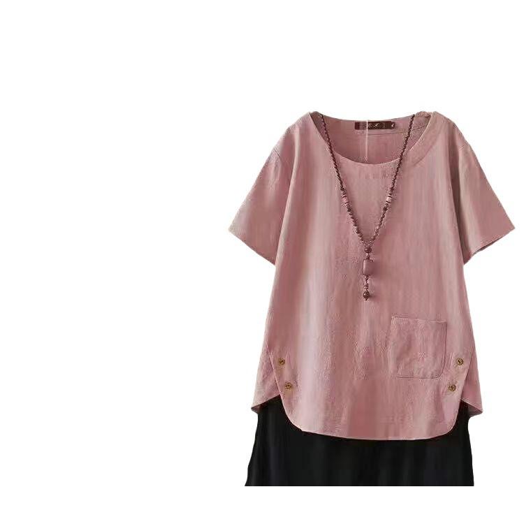Ощутите сочетание комфорта и стиля с этой женской футболкой лета 2024 года, изготовленной из высококачественной смеси хлопка и льна.. Эта рубашка с короткими рукавами, созданная для современной женщины, которая ценит нотки ретро-японского влияния, отличается непринужденным этническим стилем и идеально подходит для прогулок в теплую погоду.. Однотонный узор и подчеркивающий достоинства V-образный вырез создают классический образ, который легко сочетается с любым летним гардеробом.. Этот топ, доступный в большом размере, обеспечивает свободную, дышащую посадку и идеально подходит для любого повседневного случая.