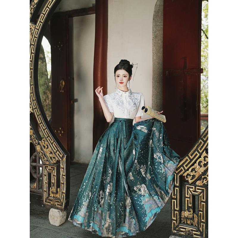 Этот изысканный комплект одежды состоит из топа с короткими рукавами и юбки с градиентным узором в виде лошадиной морды темно-зеленого цвета, предлагая современную интерпретацию традиционного китайского наряда.. Оба изделия изготовлены из мягкого и дышащего хлопка, что обеспечивает комфорт и долговечность в любом случае.. Верх украшен элегантной цветочной вышивкой, что добавляет нотку изысканности и культурного очарования.. Этот комплект прекрасно сочетает в себе вневременной стиль и современную эстетику, что делает его идеальным выбором для тех, кто ценит моду с культурным наследием.