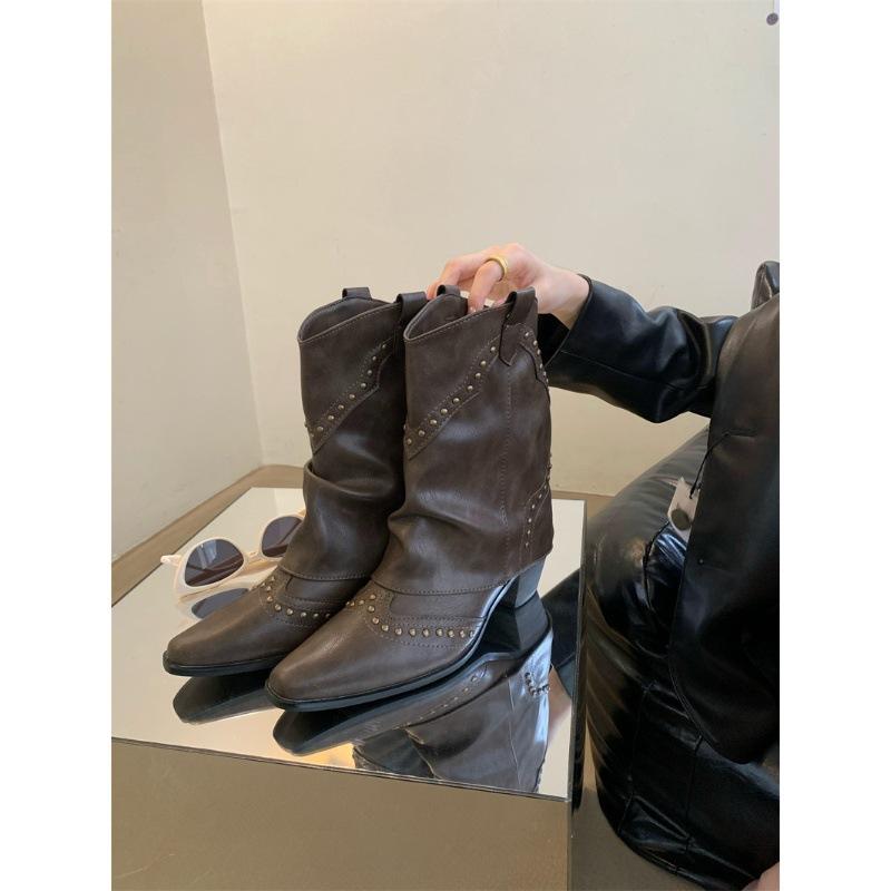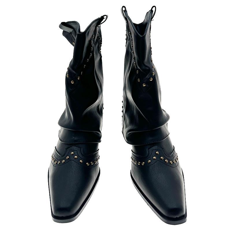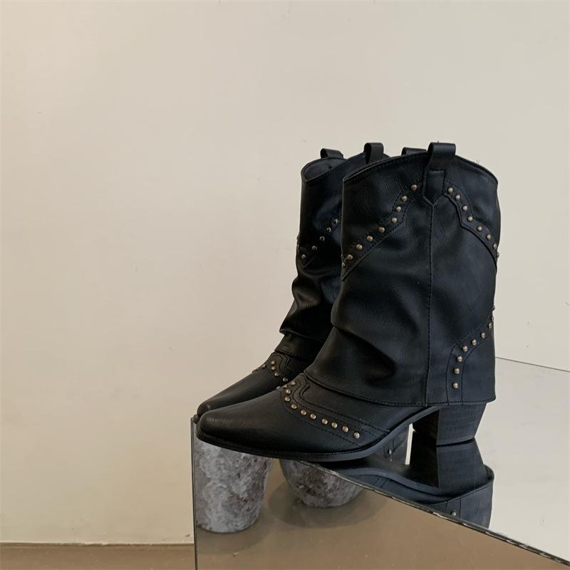 Британские ретро-сапоги в стиле рыцаря 2025 года с острыми носками и рукавами на среднем каблуке средней высоты с заостренным носком и тонкими модными ботинками